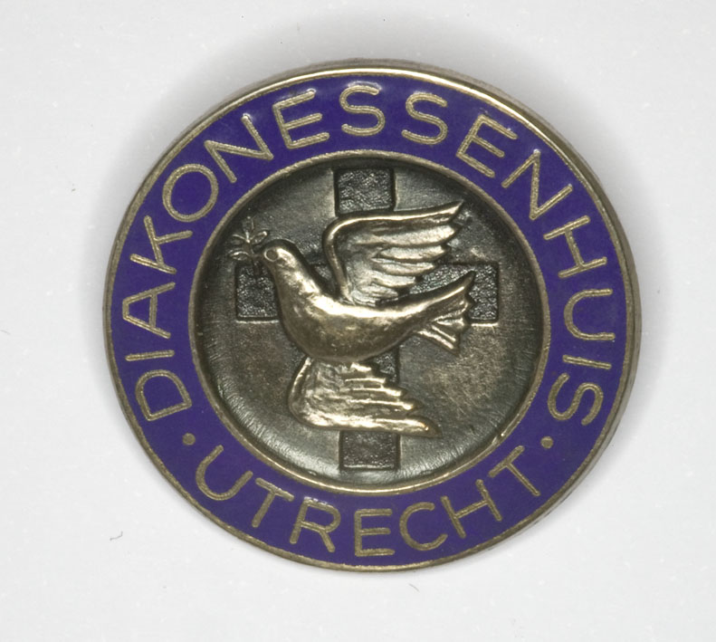 Speldje, Diakonessenhuis Utrecht, met duif met takje op kruis, deels blauw geëmailleerd