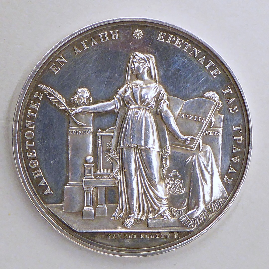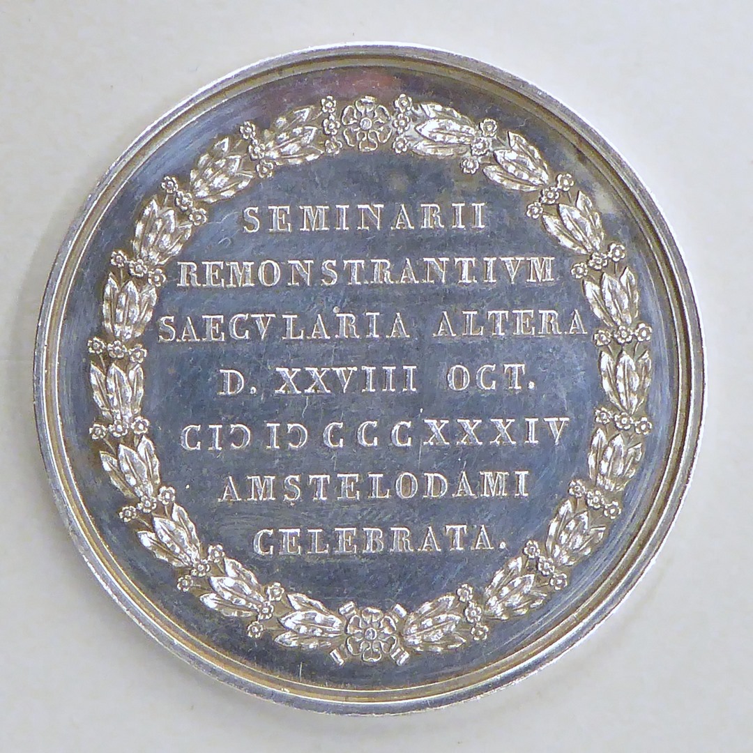 Gedenkpenning 200-jaar Remonstrants Seminarie met vrouwfiguur en Griekse tekst, kz. Latijnse tekst