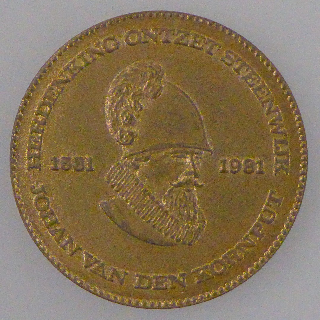 Gedenkpenning ontzet Steenwijk, met Ned. leeuw met randschrift, kz. Johan v.d. Kornput 1581-1981