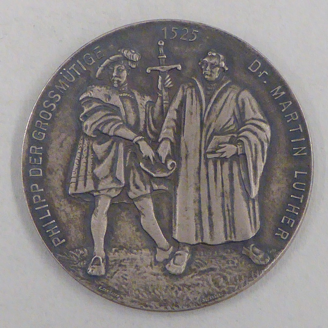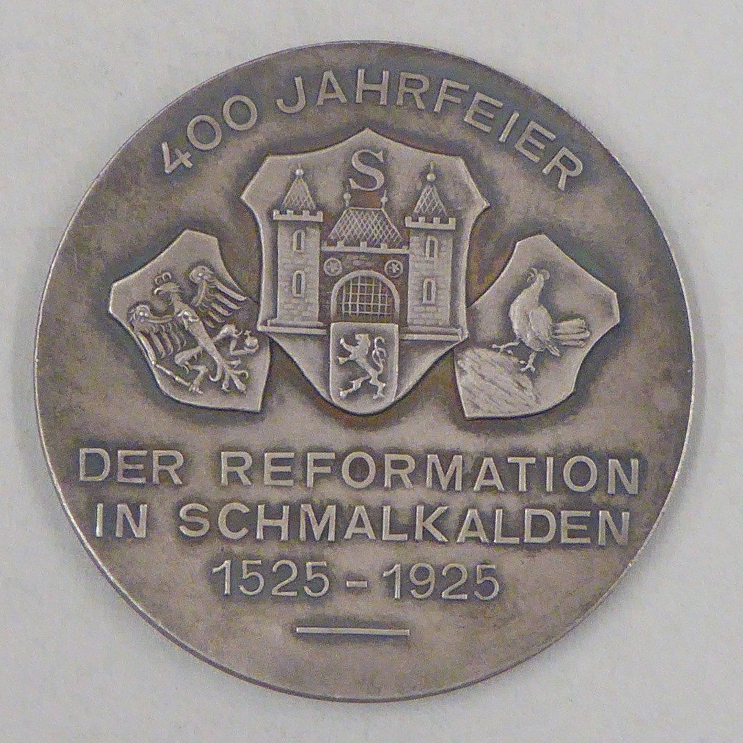Gedenkpenning 400 jaar reformatie in Schmalkalden met Philipp der Grossmütige en Luther, kz. wapens