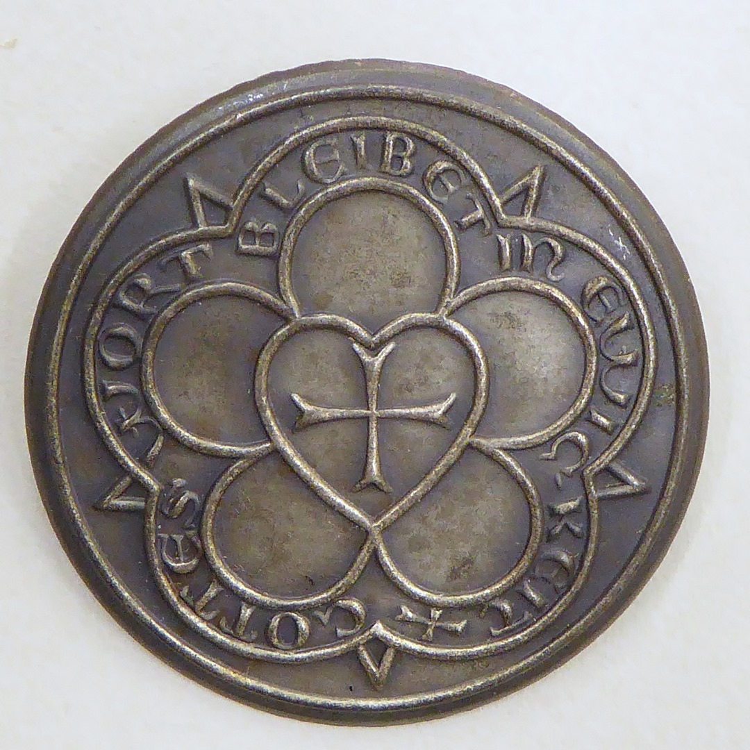 Speld met bloemvormig wapen met hart in het midden en met randschrift "Gottes wort... Ewigheit"