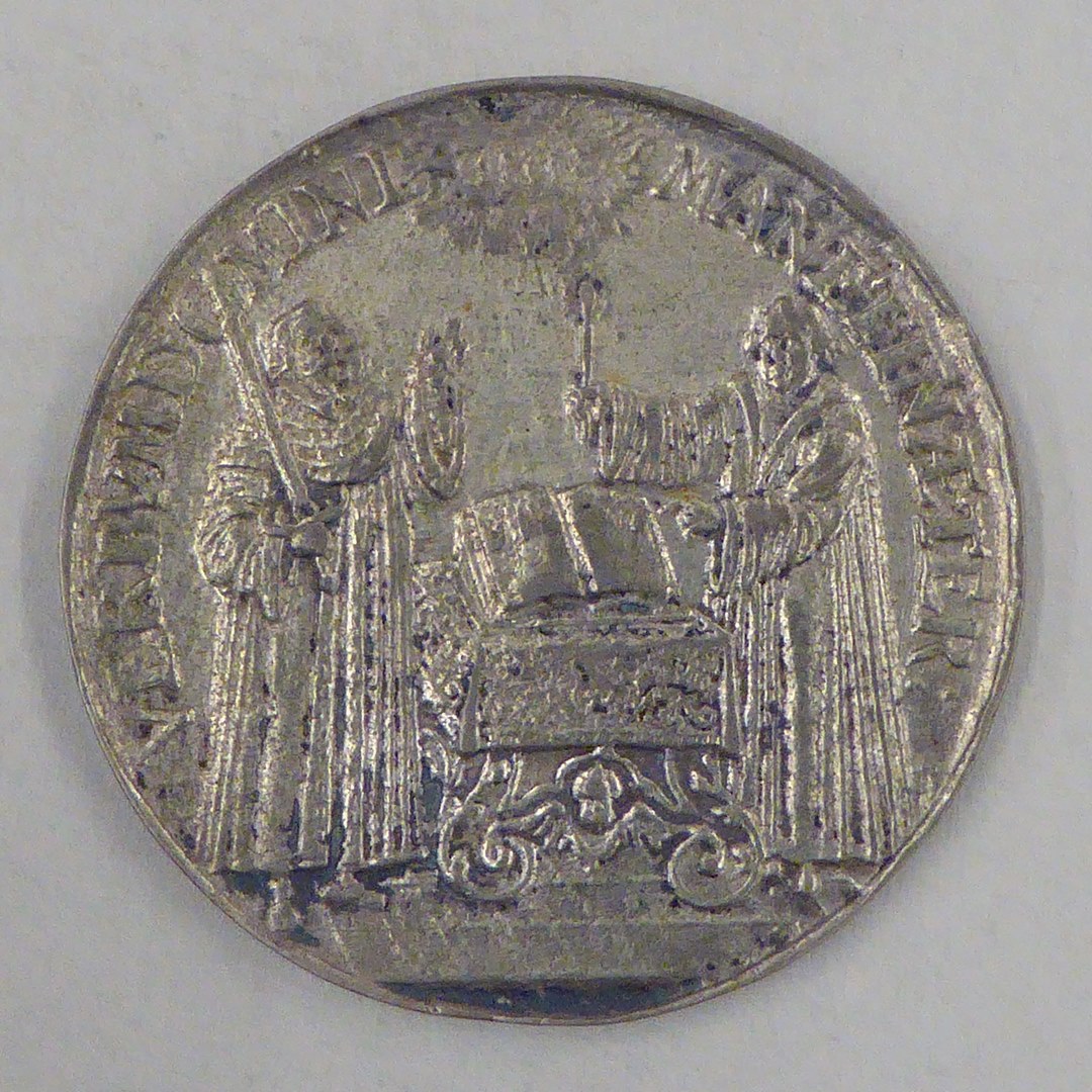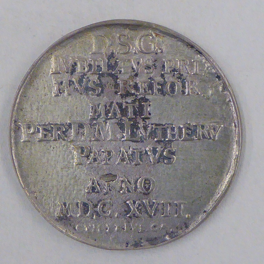 Gedenkpenning, twee geestelijken bij tafel met boek, kz. "D.S.G. Iubilaeus Primus...Anno MDCXVII"