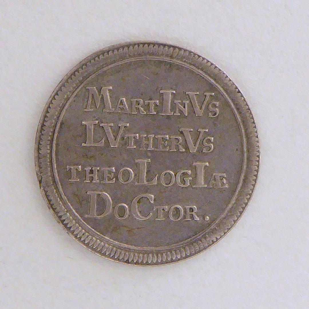 Penning met kandelaar met brandende kaars, kz. met "Martinus Lutherus theologiae doctor"
