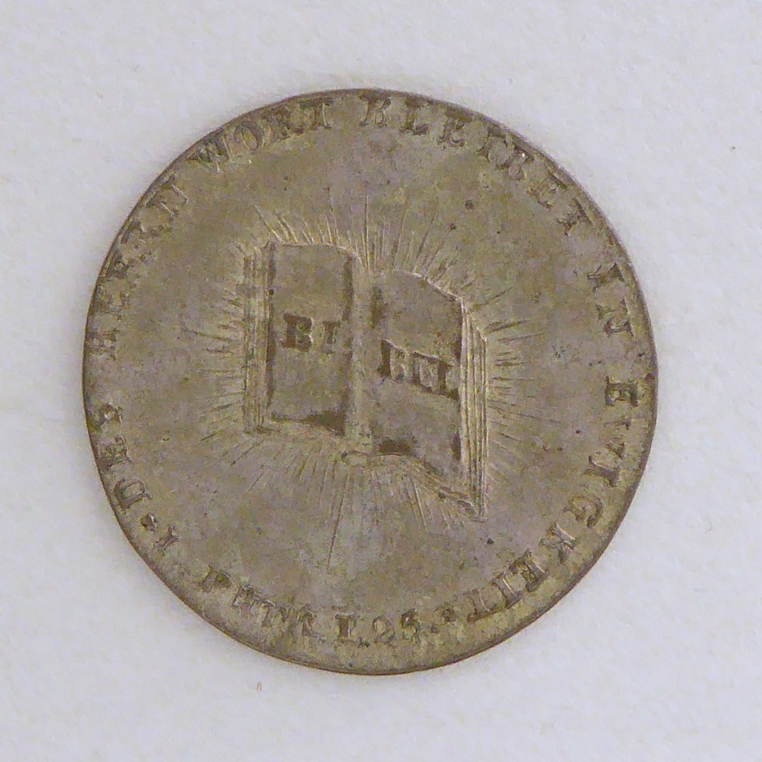 Penning met opengeslagen bijbel, met "Des Herrn Wort... 1 Petr.1:25", kz. tekst