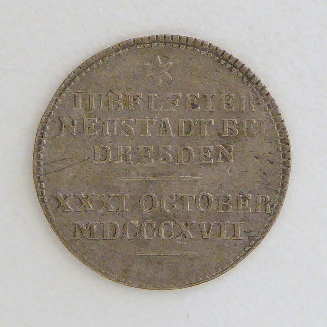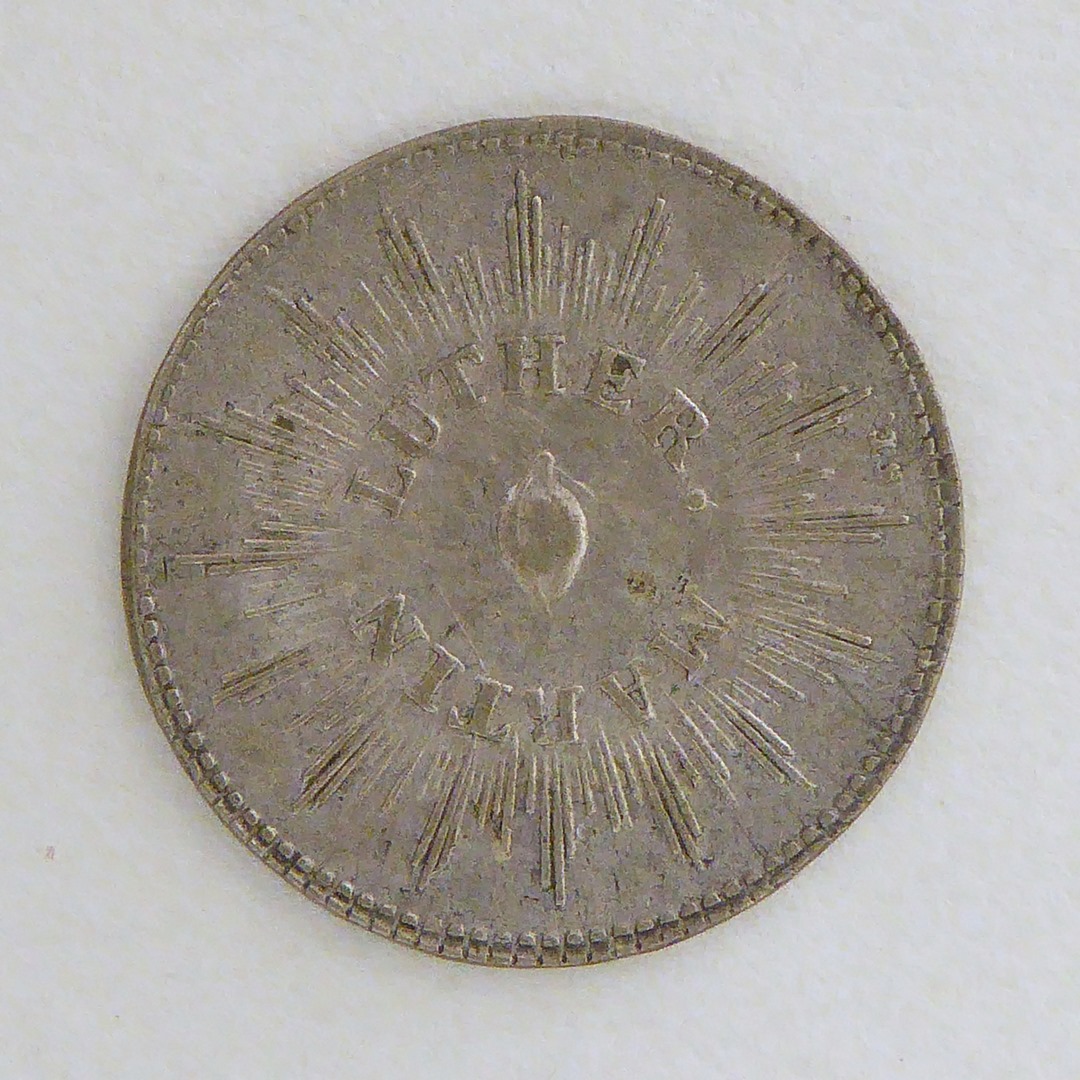 Penning met naam van M. Luther, omgeven door stralenkrans, kz. met "...Neustadt bei Dresden..."