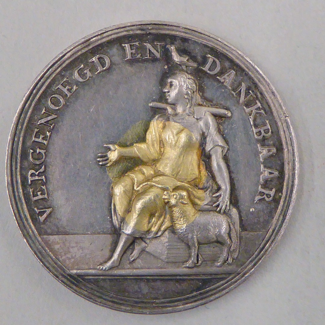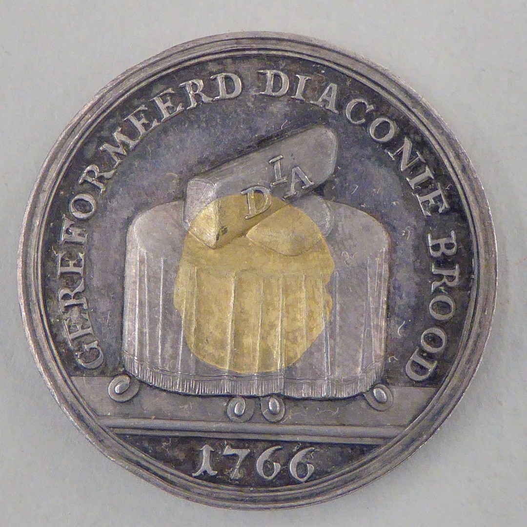 Broodpenning Amsterdam met zittende Barmhartigheid met lam en met "vergenoegd en dankbaar", kz. twee broden op afgerokte tafel met "Gereformeerd diaconie brood 1766"