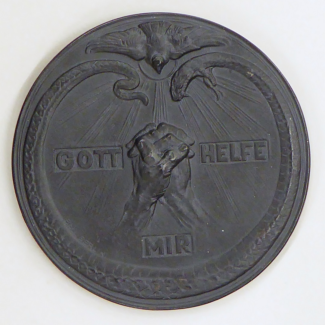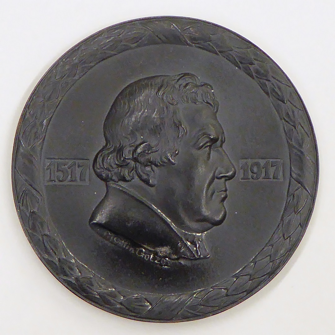 Penning met portret Luther, jaartallen 1517-1917, kz. ineengeslagen handen in cirkel van slang, duif