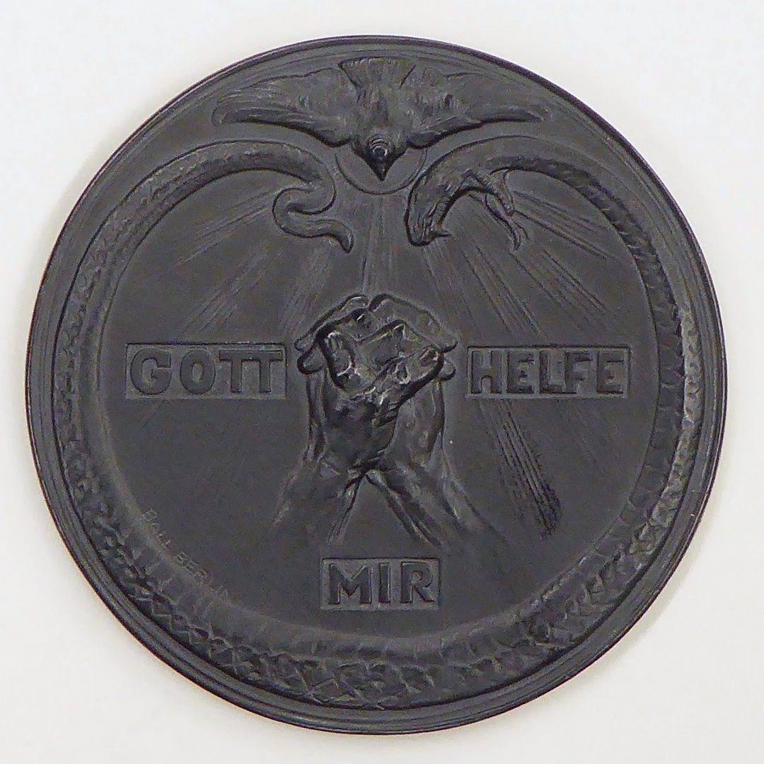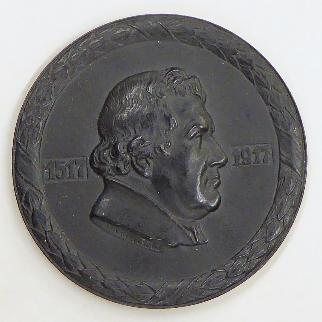 Penning met portret Luther, jaartallen 1517-1917, kz. ineengeslagen handen in cirkel van slang, duif