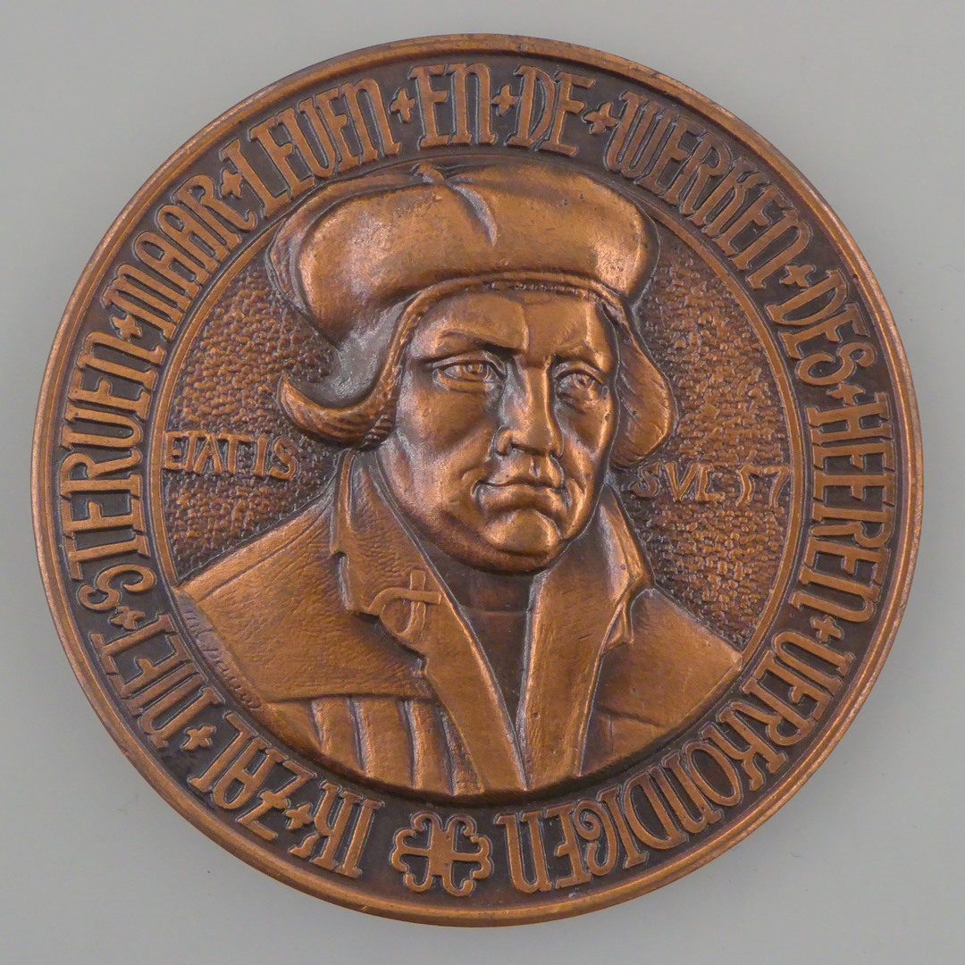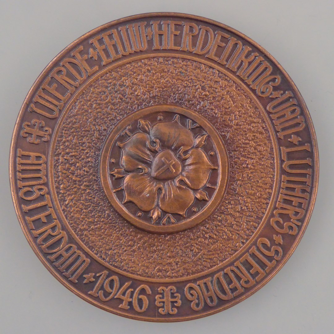 Gedenkpenning vierde eeuw Luthers sterfdag, met portret, "Aetatis suae 57" en randschrift, kz. Lutherroos met "Vierde ..."