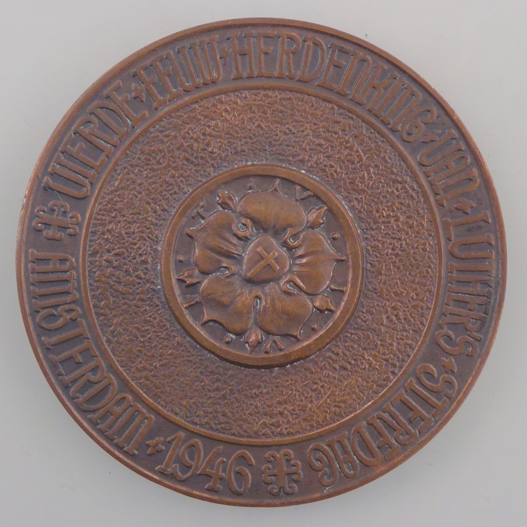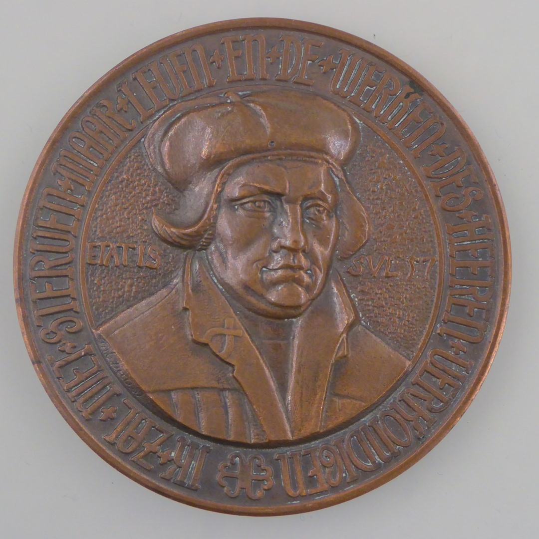 Gedenkpenning vierde eeuw Luthers sterfdag, met portret, "Aetatis suae 57" en randschrift, kz. Lutherroos met "Vierde ..."