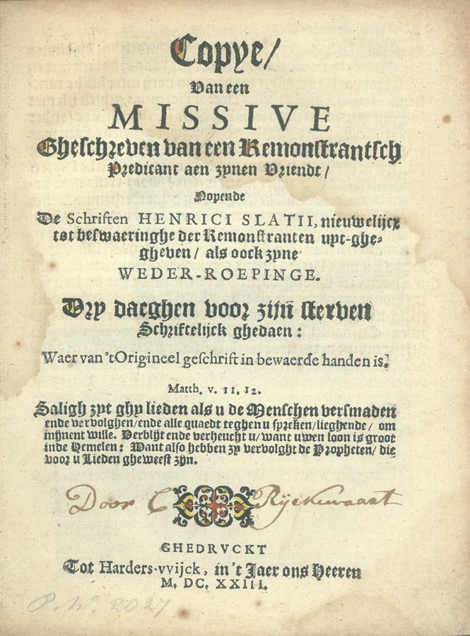 Copye, van een Missive geschreven van een remonstrantsch predicant aen zynen vriendt, nopende de schriften Henrici Slatii, nieuwelijcx tot beswaeringhe der remonstranten uyt-ghegheven, als oock zyne Weder-roepinge [...]