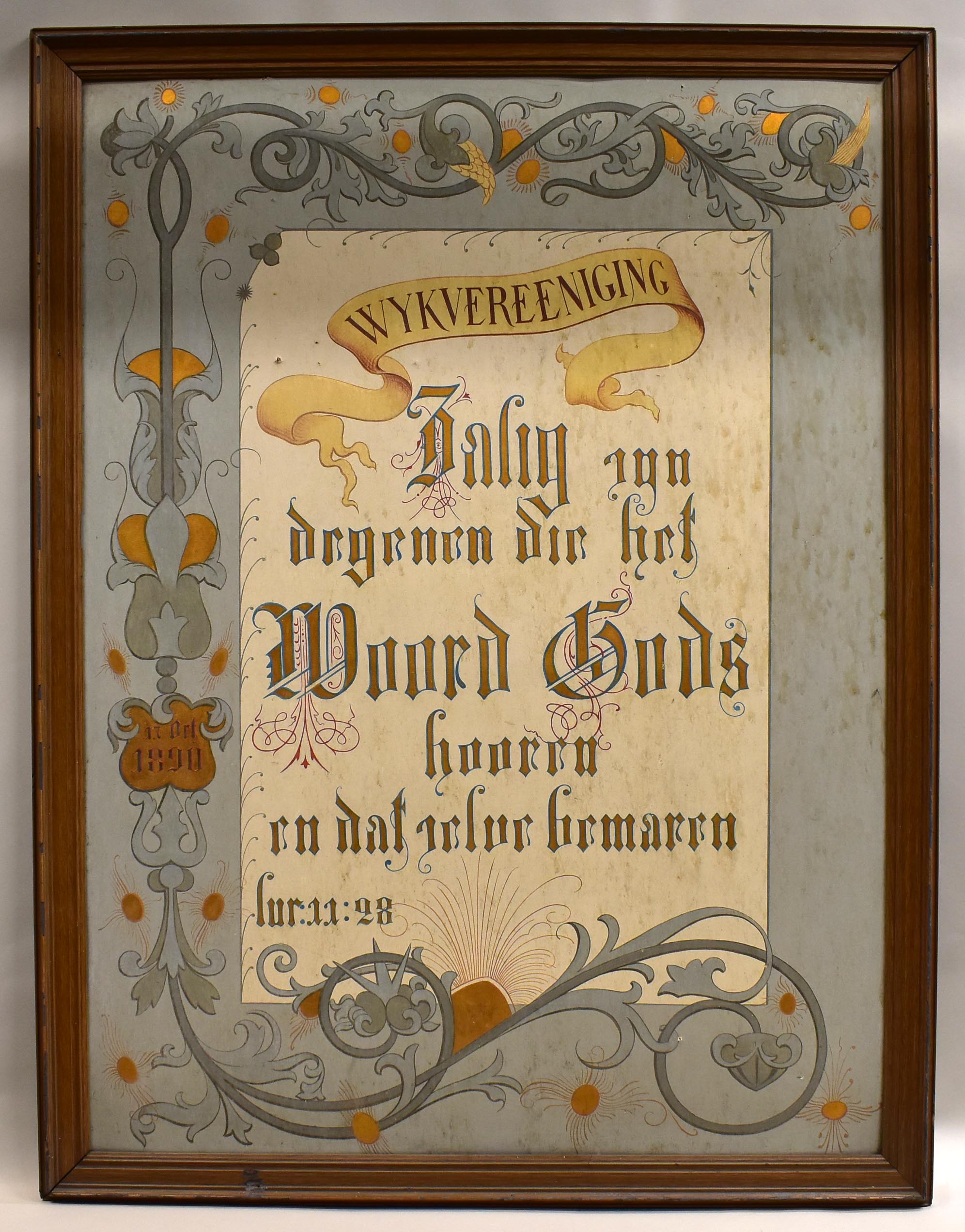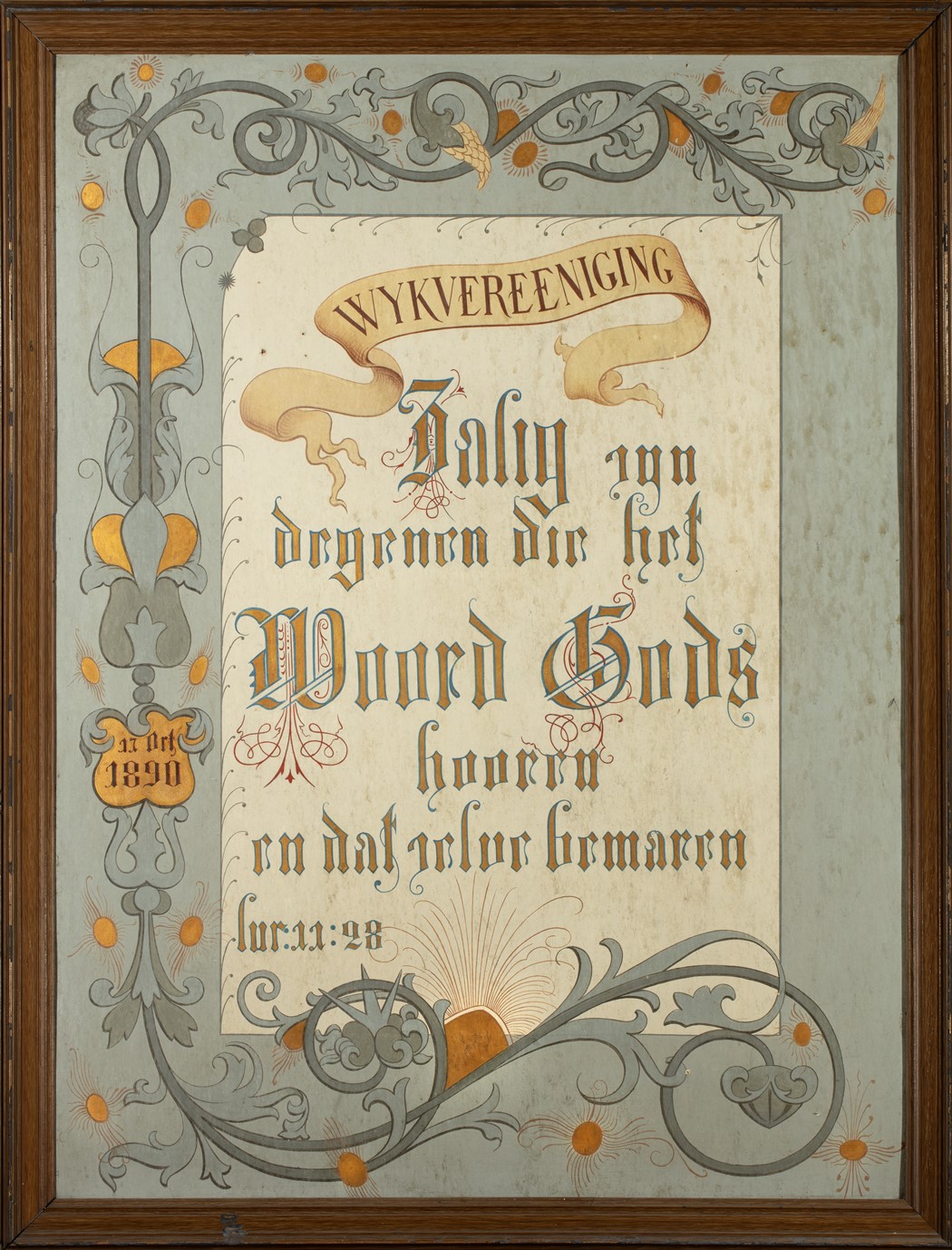 "Zalig zijn degenen die het woord Gods hooren en dat zelve bewaren" gouden tekst, witte achtergrond