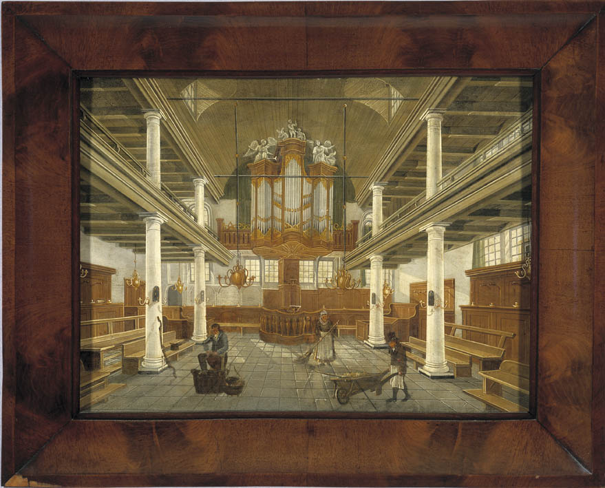 Interieur van de doopsgezinde kerk De Zon te Amsterdam