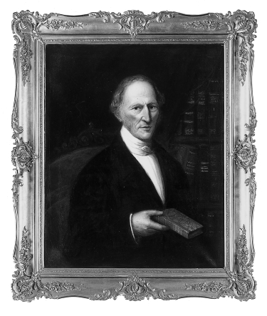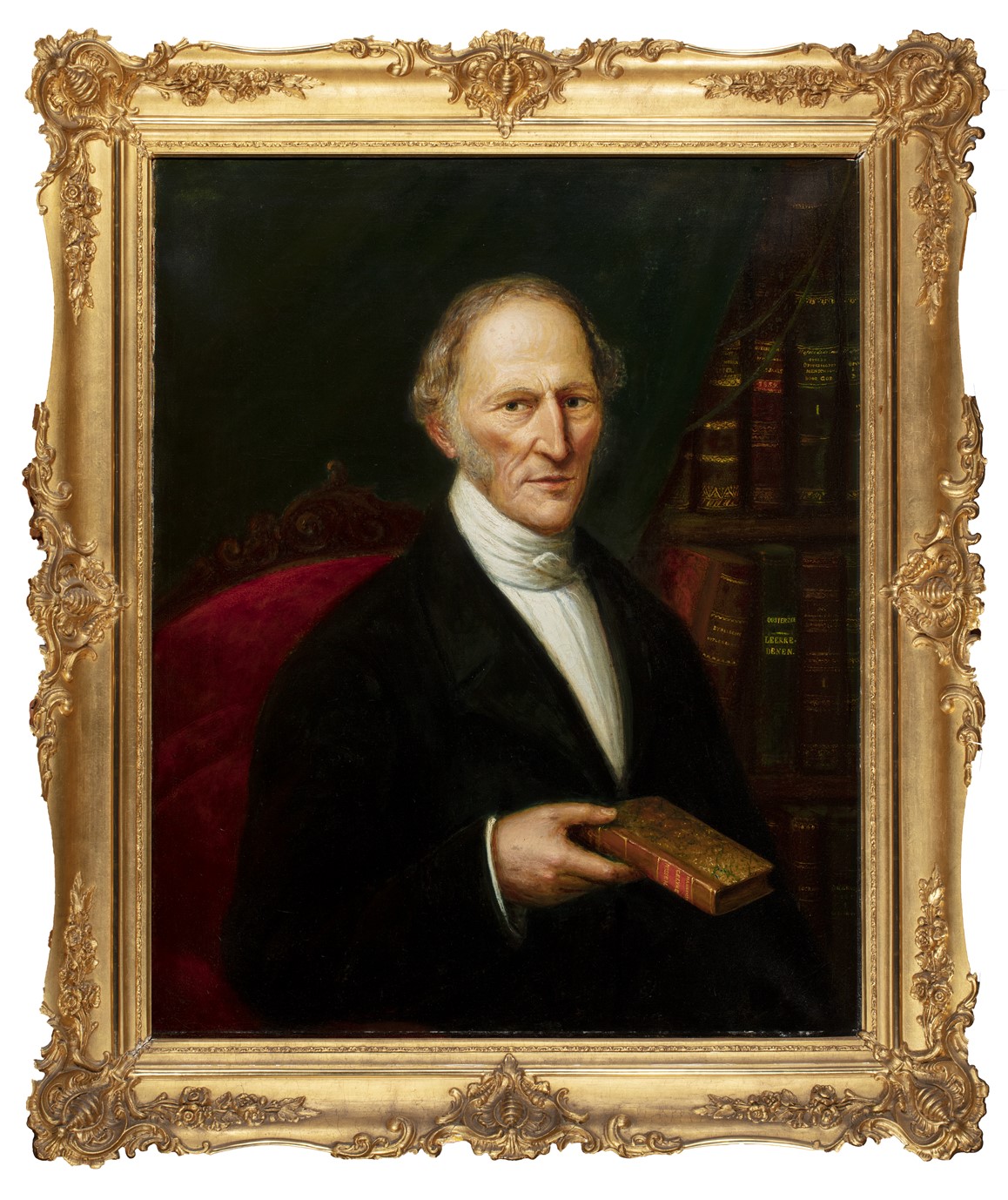 In zijn hand houdt Anneveld zijn eigen werk: H. ANNEVELD / GELYKENISSEN (De belangwekkende gelijkenissen van den Heiland der wereld; eene handleiding voor mijne leerlingen, Amsterdam 1836). Daarachter een boekenkast met op de bovenste plank van links naar rechts: OENS / [...]THEDEN / DEN / OPPER[...]; OVERD[...]N /OP [...] / JAARS / 1859 en HOFSTEDE ...