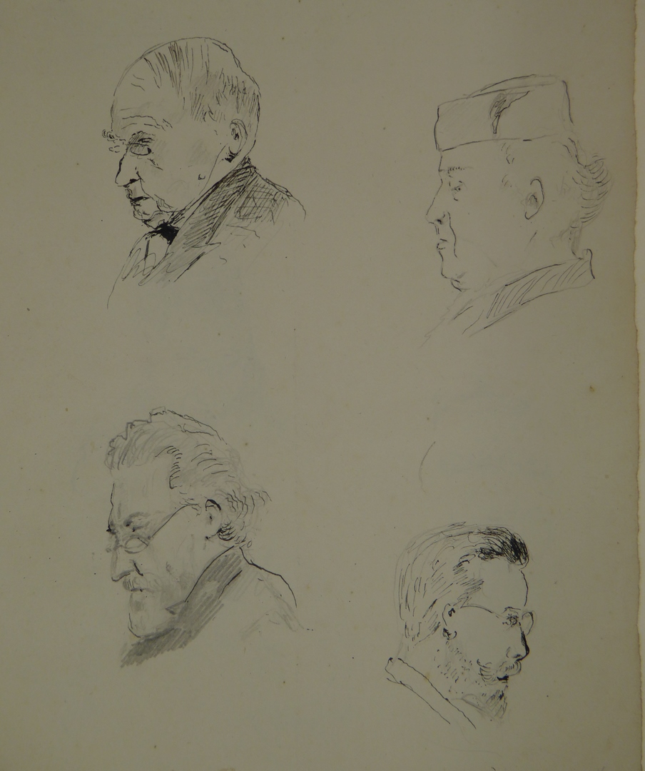 Blad met schetsen en portretten van W. Ellens, P.W. Kamphuizen en P. van Melle
