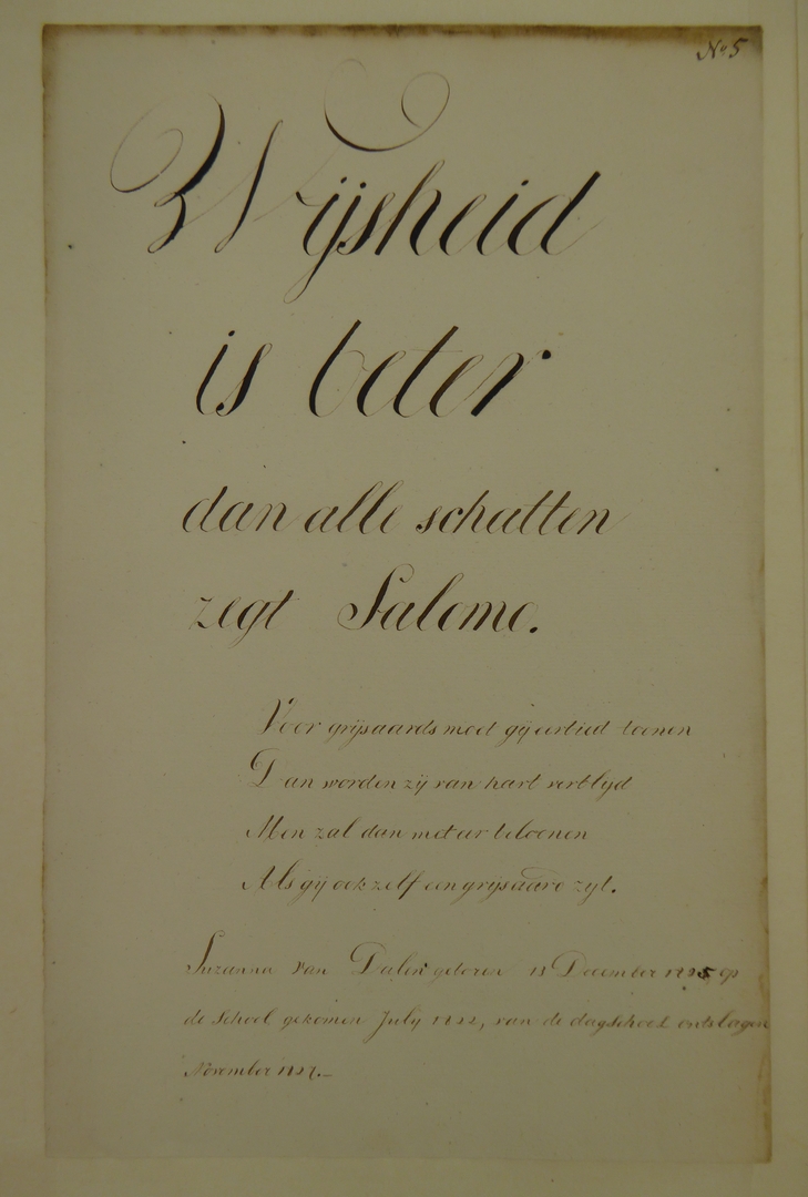 Voorbeeld schoonschrift doopsgezinde school te Haarlem: "Wijsheid is beter dan alle schatten"