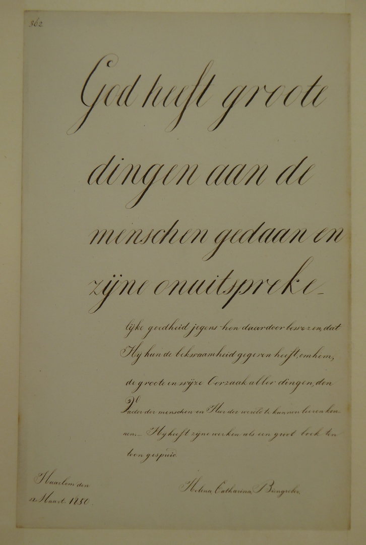 Voorbeeld schoonschrift doopsgezinde school te Haarlem: "God heeft grote dingen aan menschen..."