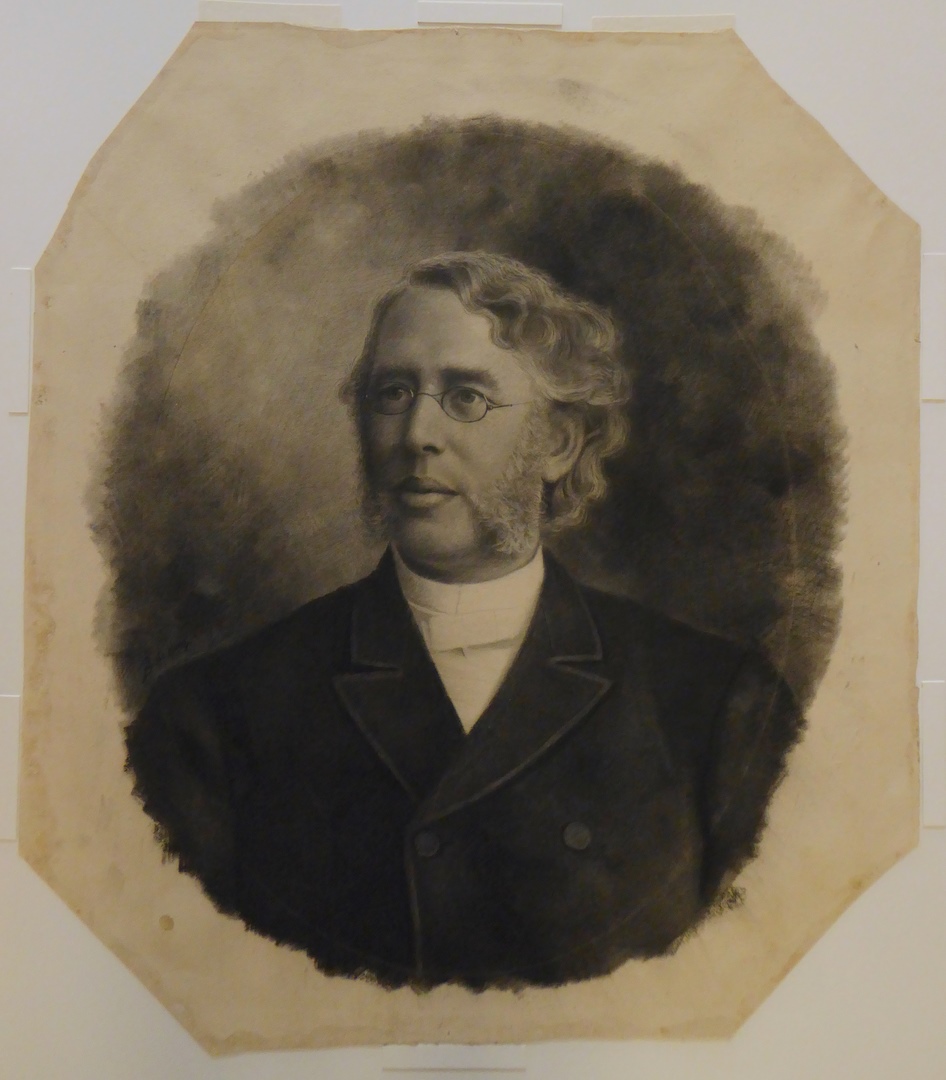 Borstbeeld naar links in een ovaal. De geportretteerde heeft krullend, grijs haar en brede bakkebaarden. Hij draagt een bril en is gekleed in een donkere jas met een dubbele rij knopen, waarboven een witte boord uitsteekt. Linksboven de schouder gesigneerd 'B. de Hoog'. De tekening is achtkantig. Rondom de voorgestelde is, in potlood, een ovaal ...