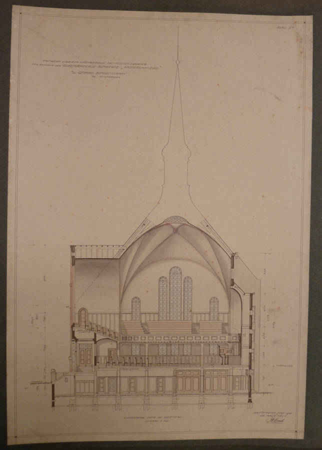 Ontwerp kerk Gerard Brandtstraat te Amsterdam: doorsnede over de diepteas