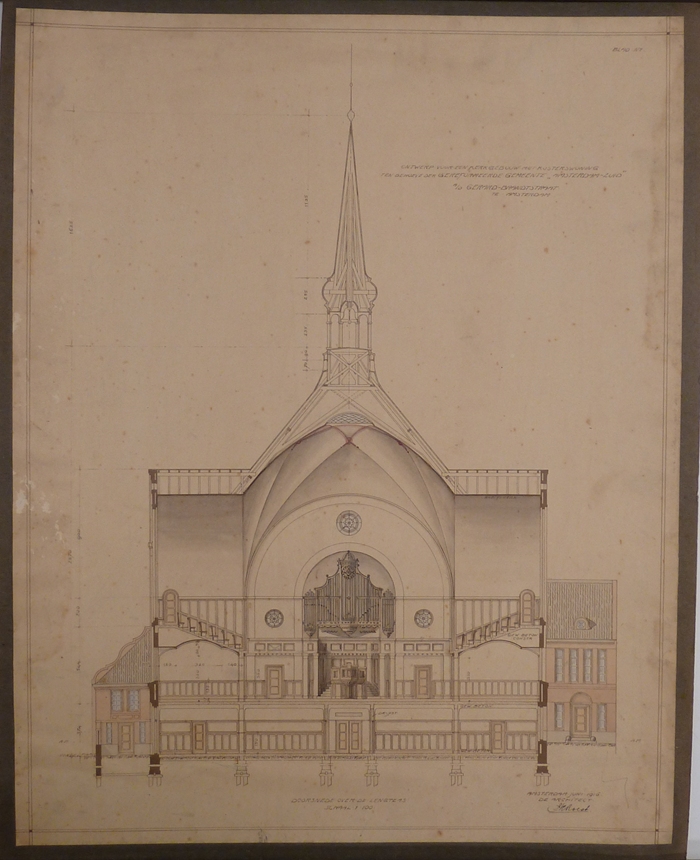 Ontwerp kerk Gerard Brandtstraat te Amsterdam: doorsnede over de lengteas