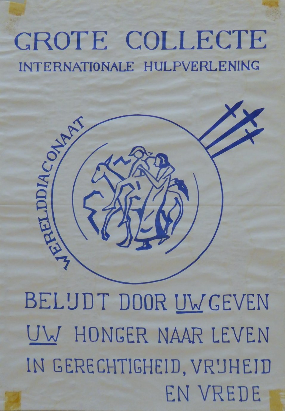 Getekend affiche met symbool werelddiaconaat en "Grote collecte internationale hulpverlening ..."