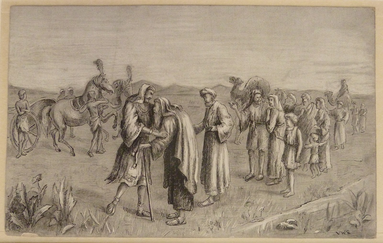 Serie tekeningen voor boeken van Callenbach: de ontmoeting van Jakob en Jozef