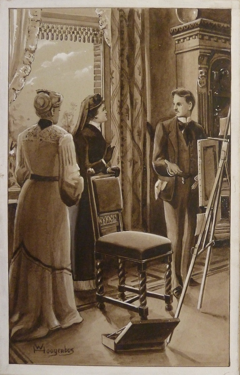 Serie tekeningen voor "Nelly van Sommeren" (Callenbach): Karel in gesprek met twee vrouwen