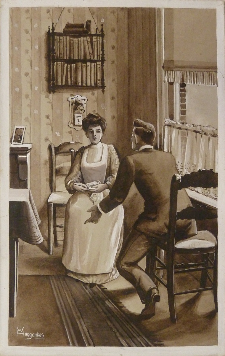 Serie tekeningen voor "Nelly van Sommeren" (Callenbach): Nellie en Willem in de woonkamer