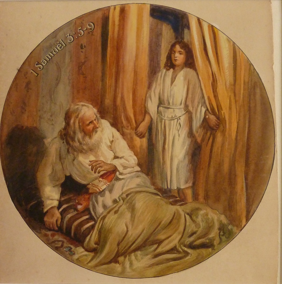 Tekening voor een boek van Callenbach: Samuël komt voor de derde keer bij Eli (1 Sam.3:5-9)