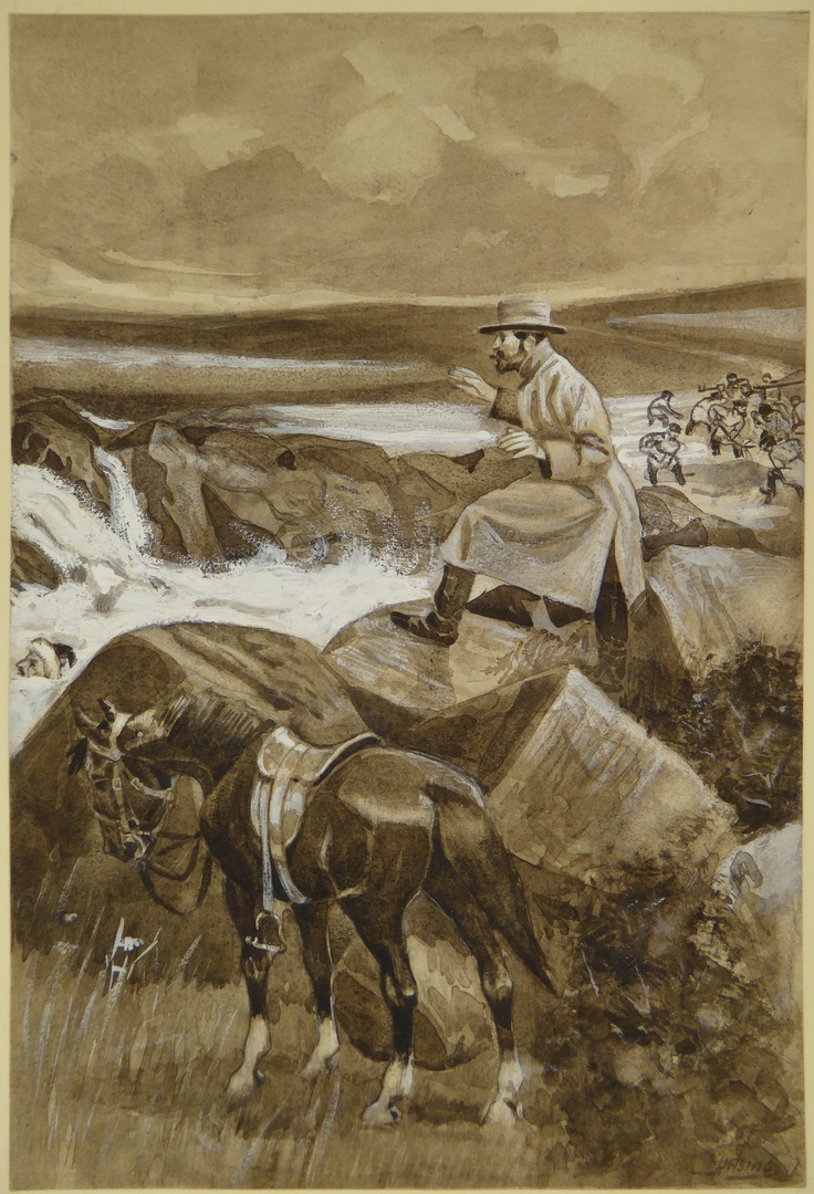Tekening voor een boek van Callenbach: man met paard aan rivier, steengroeve op de achtergrond