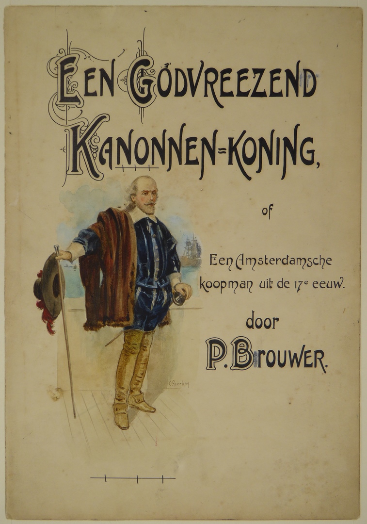 Ontwerp omslag kinderboek: Een godvreezend kanonnen-koning of Een Amsterdamsche koopman uit de 17e eeuw door P. Brouwer