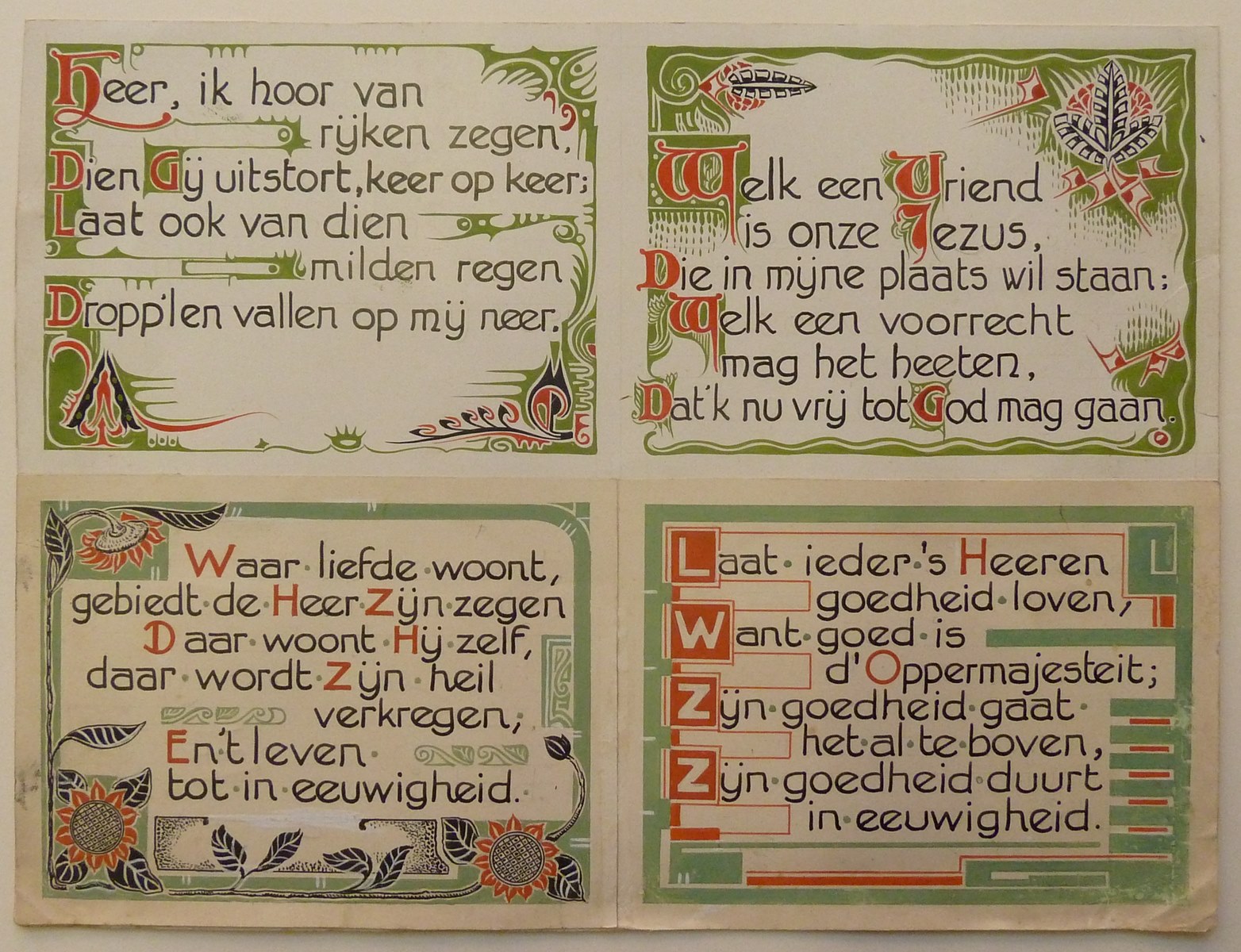 Vier tekstontwerpen met beginregels van protestants-Christelijke liederen "Heer, ik ..."