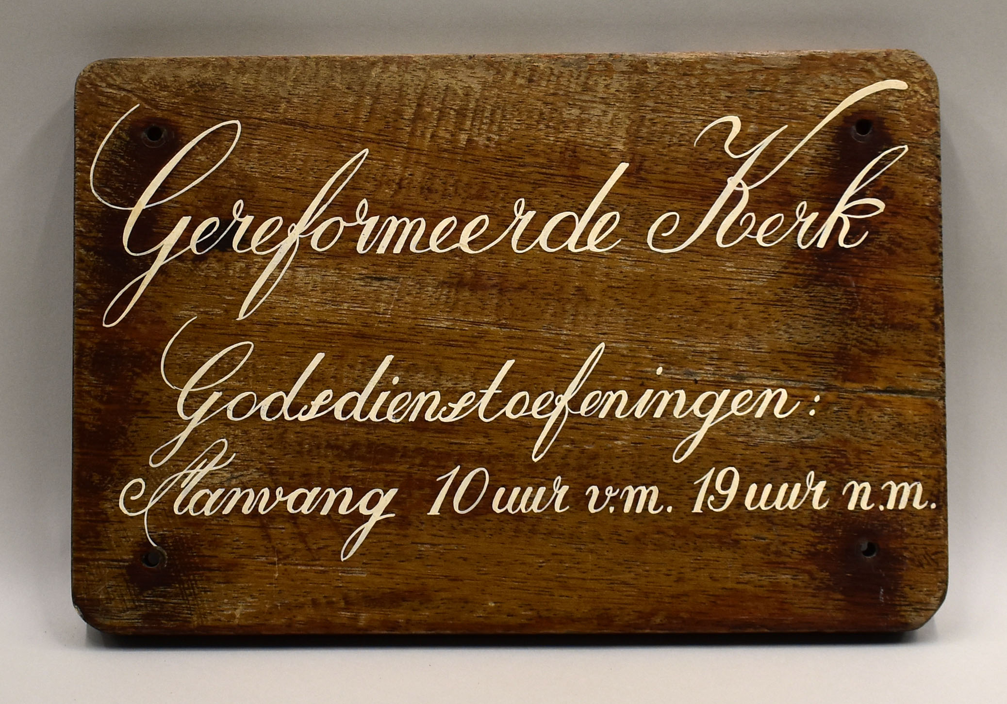 Bord met "Gereformeerde Kerk godsdienstoefeningen aanvang 10 uur v.m. 19 uur n.m."