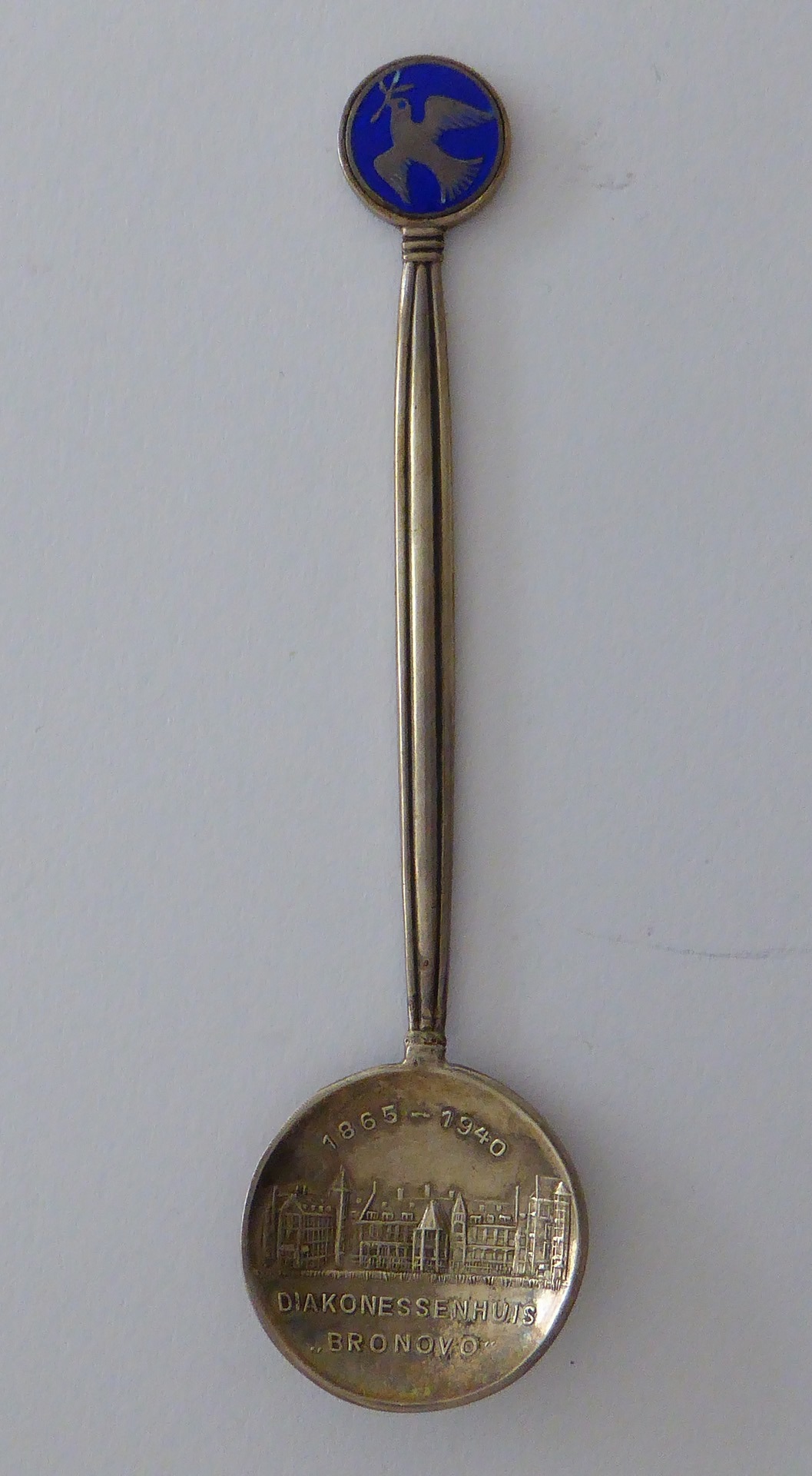 Lepeltje met embleem van duifje, met "Diakonessenhuis Bronovo...", van Hendrika Kley