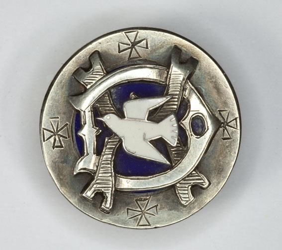 Insigne met wit duifje op gestileerde D, kz. met "Jez.42:6, 25, 5 Febr. 1923", uit bezit van de diacones Hendrika Kley