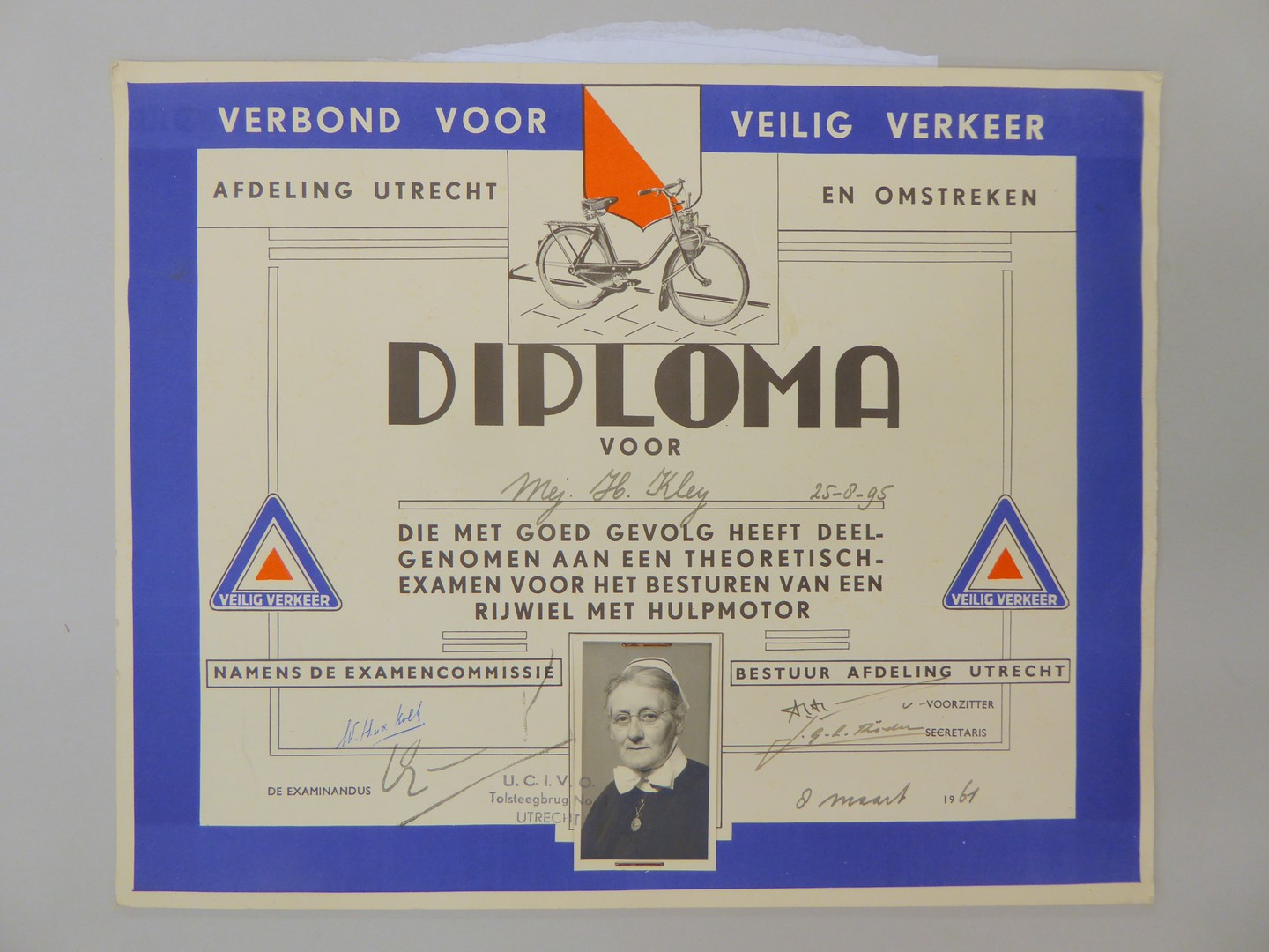 Diploma theoretisch examen voor besturen van rijwiel met hulpmotor, van Hendrika Kley