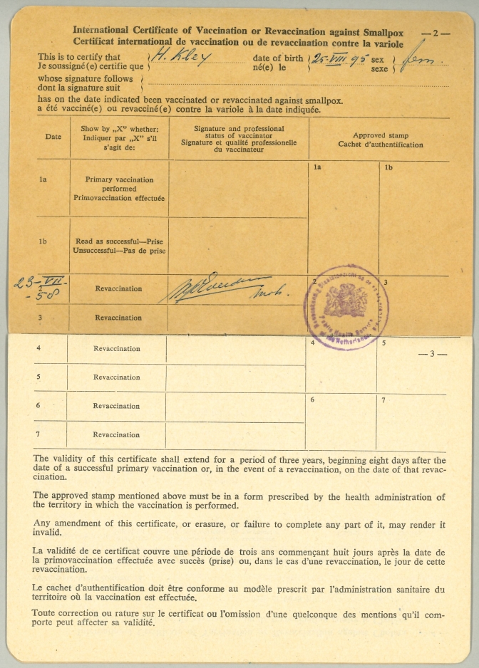 Internationaal bewijs van herinenting tegen pokken van Hendrika Kley