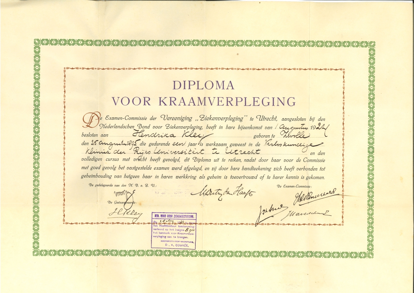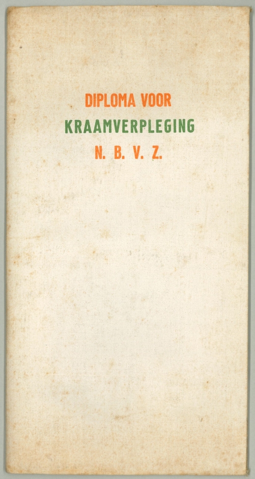 Diploma voor kraamverpleging N.B.V.Z. (Nederlandsche Bond voor Ziekenverpleging) van Hendrika Kley, in omslag