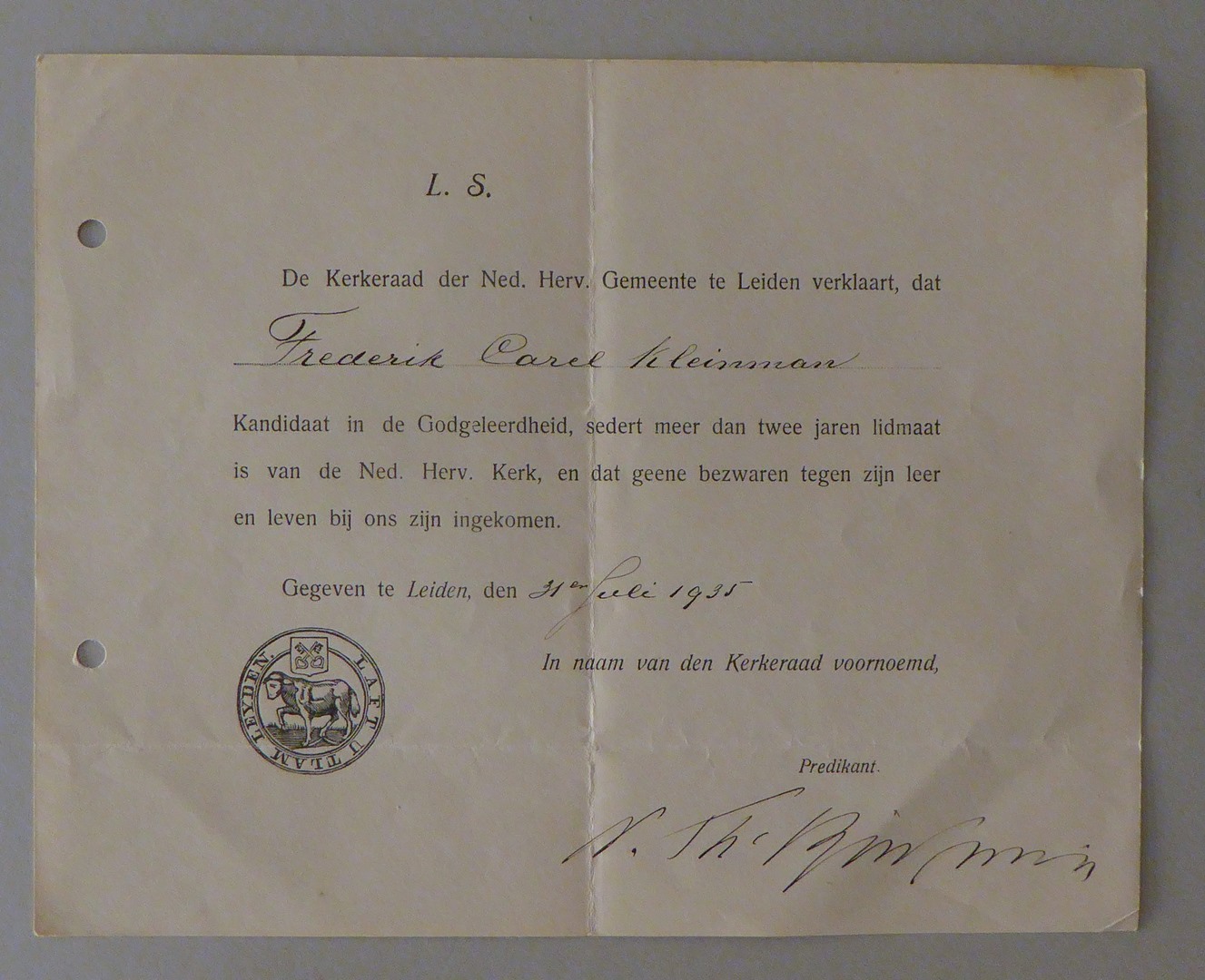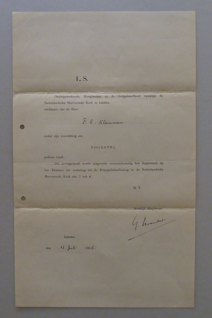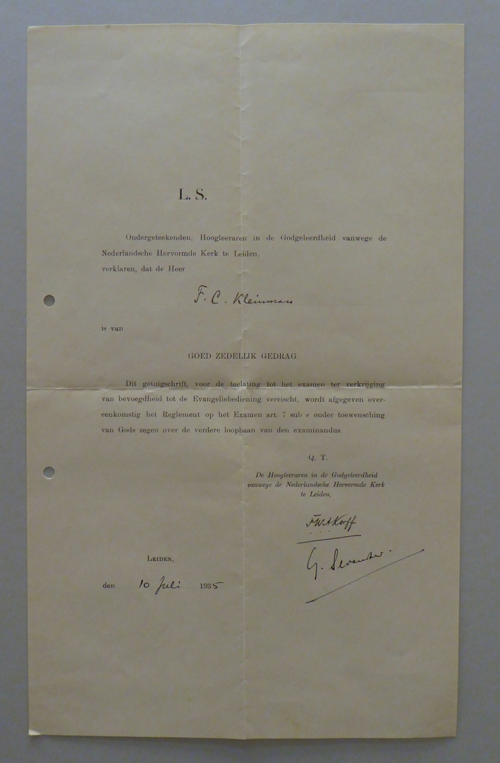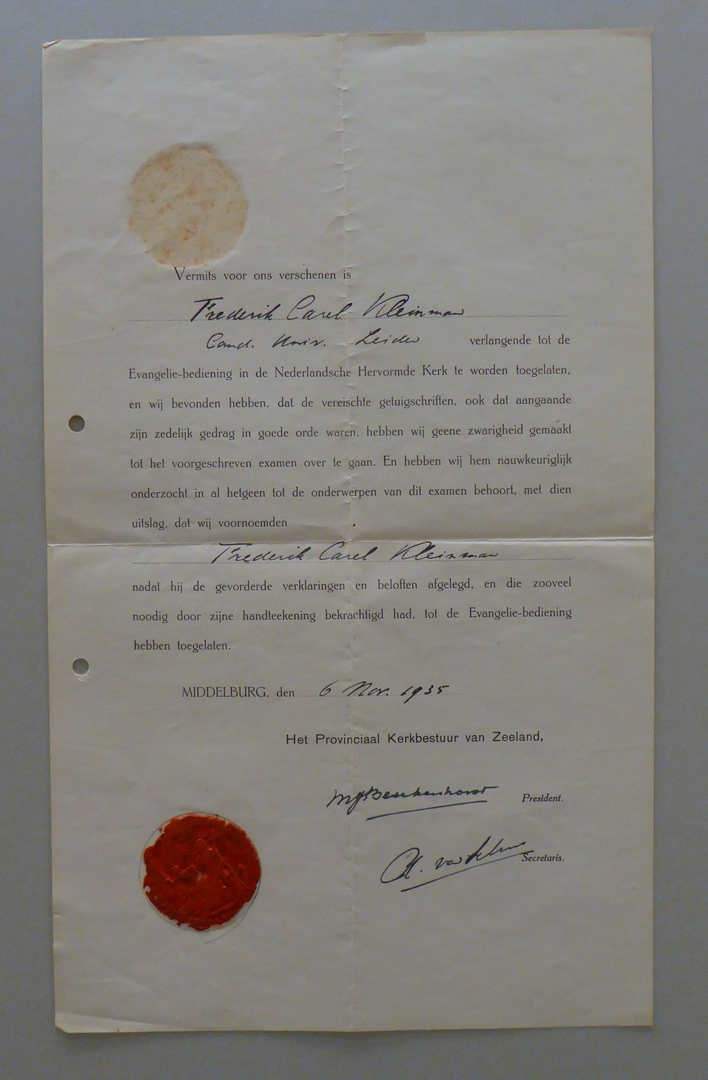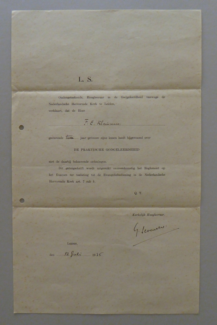 Uit nalatenschap ds. F.C. Kleinman: (academische) getuigschriften (11 stuks)