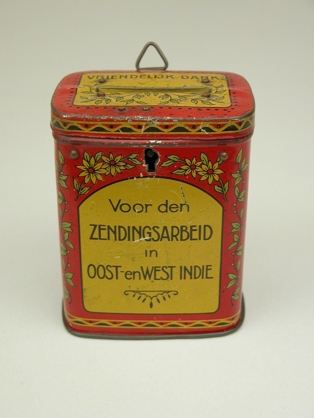 Rood zendingsbusje met in geel vlak "Voor den zendingsarbeid in Oost- en West Indië", kz. met "Uitgegeven door het Zendingsbureau Oegstgeest"