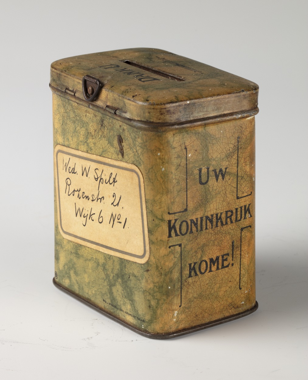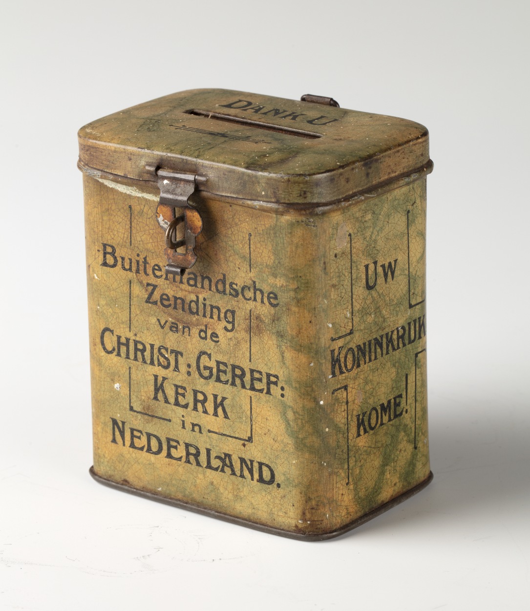 Zendingsbusje met "Buitenlandsche Zending van de christ: geref: kerk in Nederland...", met op zijkant "Uw Koninkrijk Kome!"
