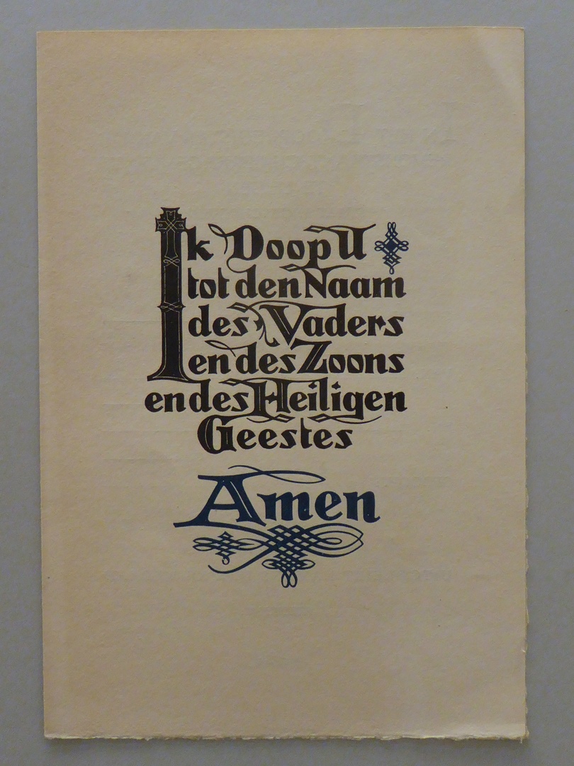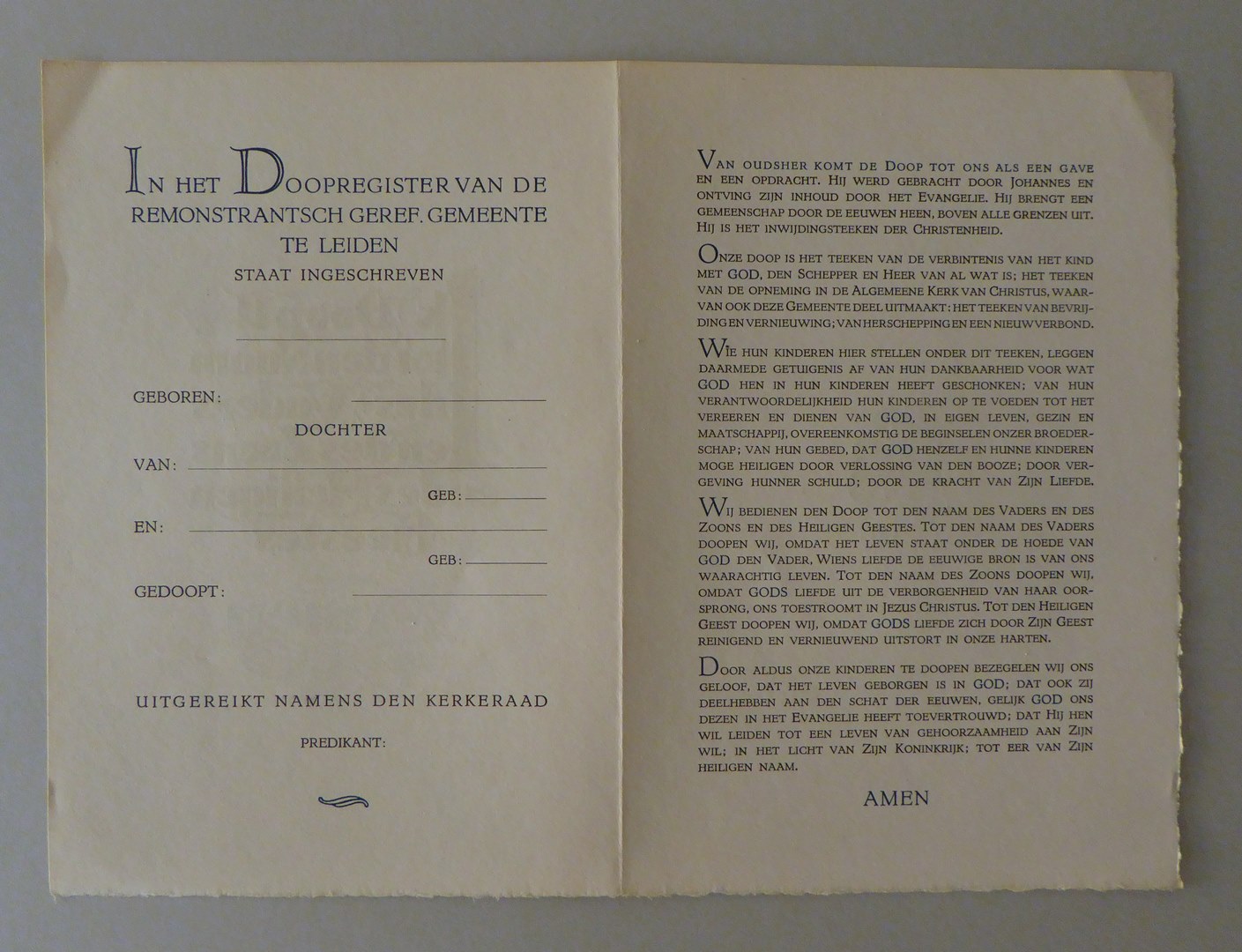 Oningevuld doopcertificaat met "Ik doop U tot den Naam des Vaders ...", remonstrantse gem. te Leiden