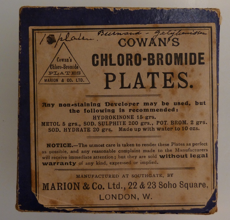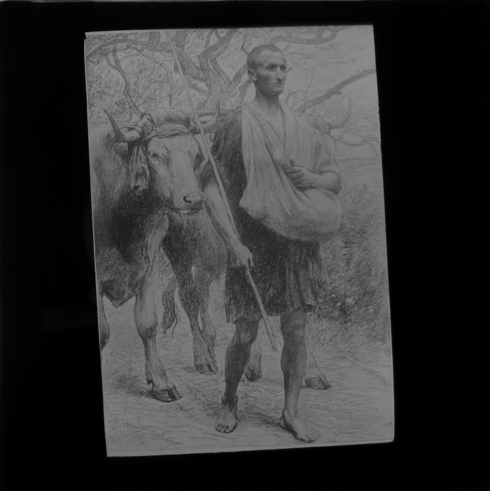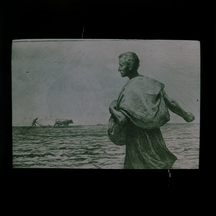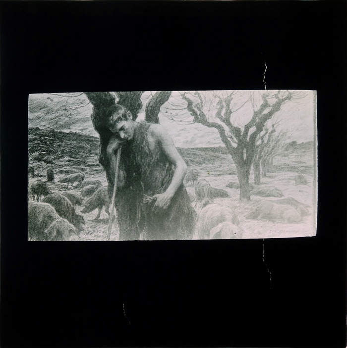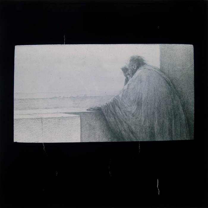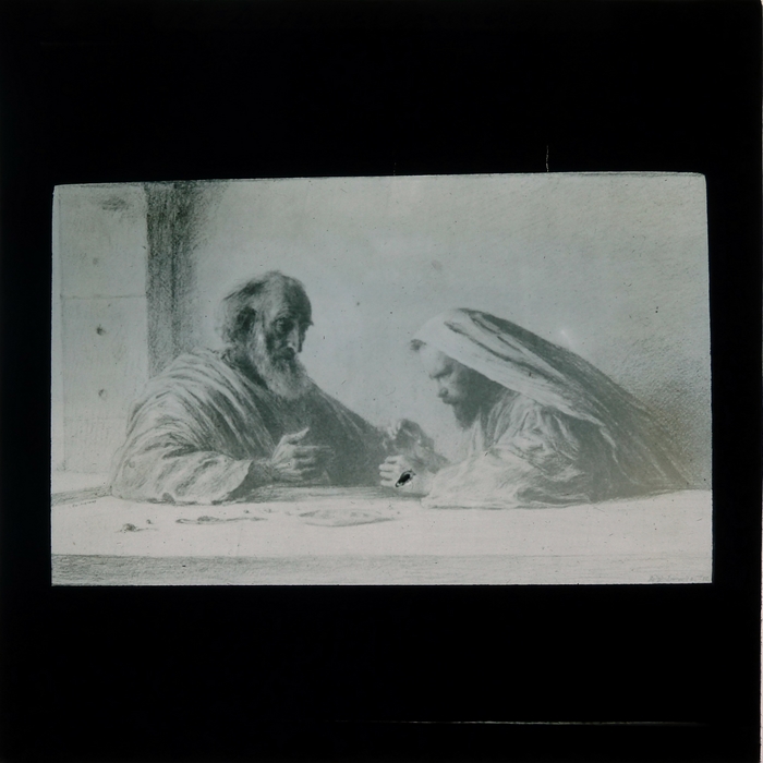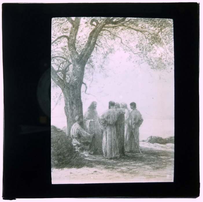 Blauw kartonnen doosje met 8 zwart-wit glasdia's met bijbelse scènes uit het Nieuwe Testament