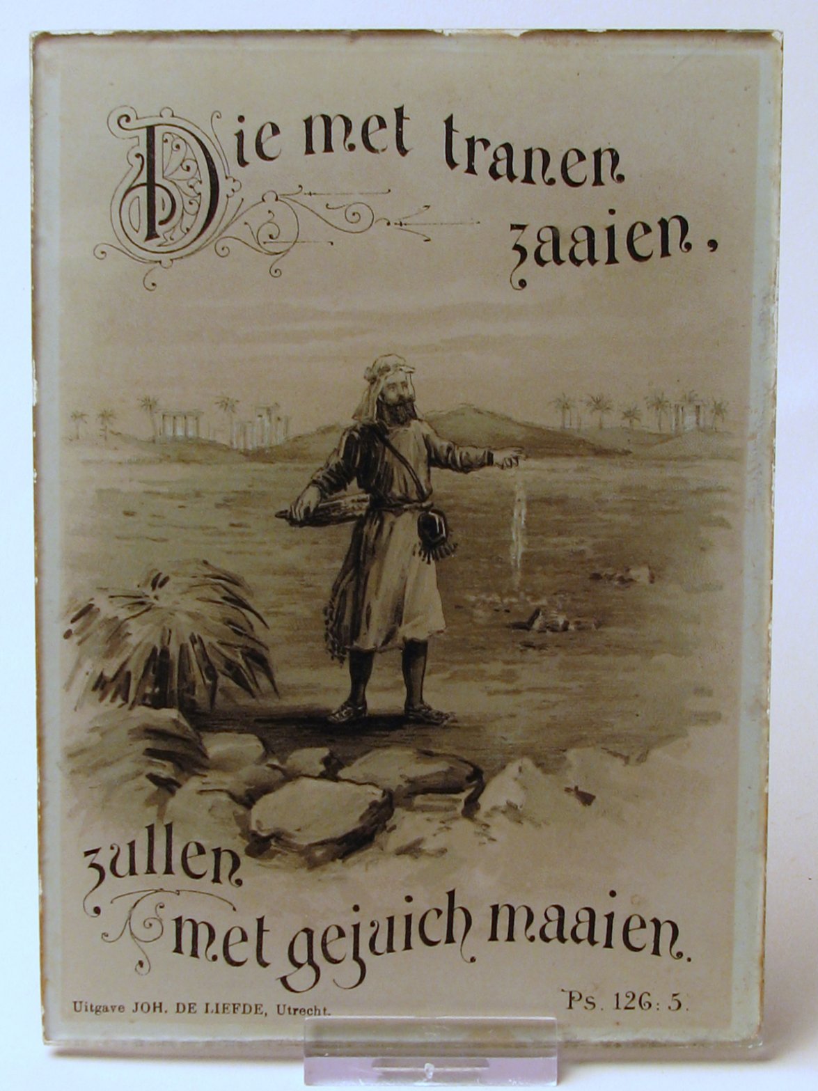 Wandbordje, prent met "Die met tranen zaaien, zullen met gejuich maaien", achter glas