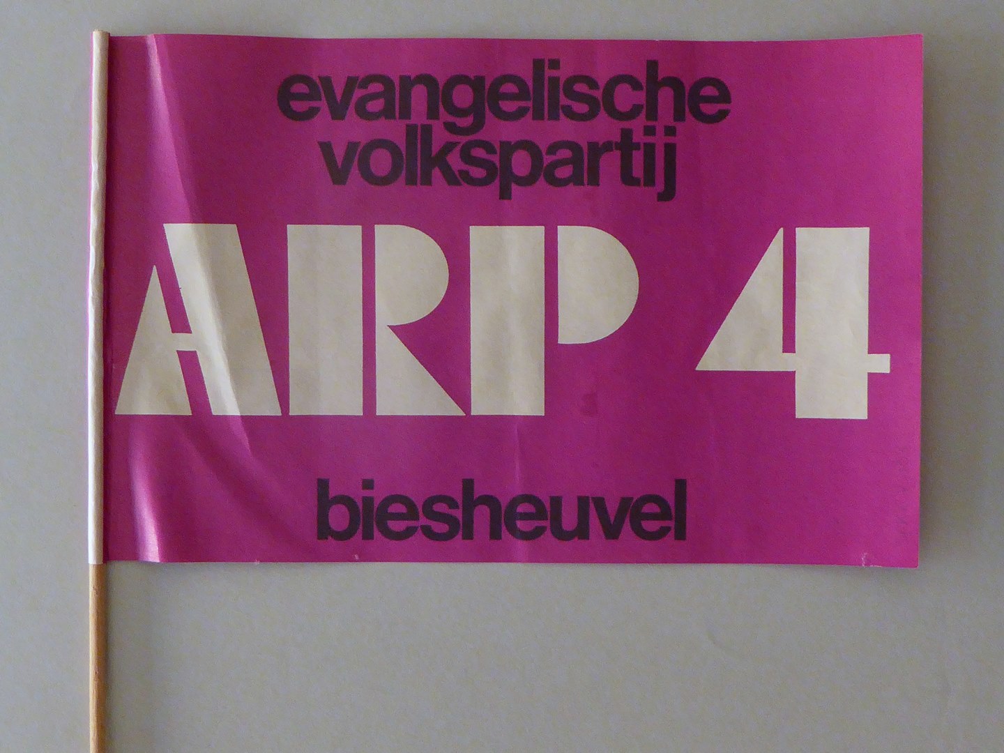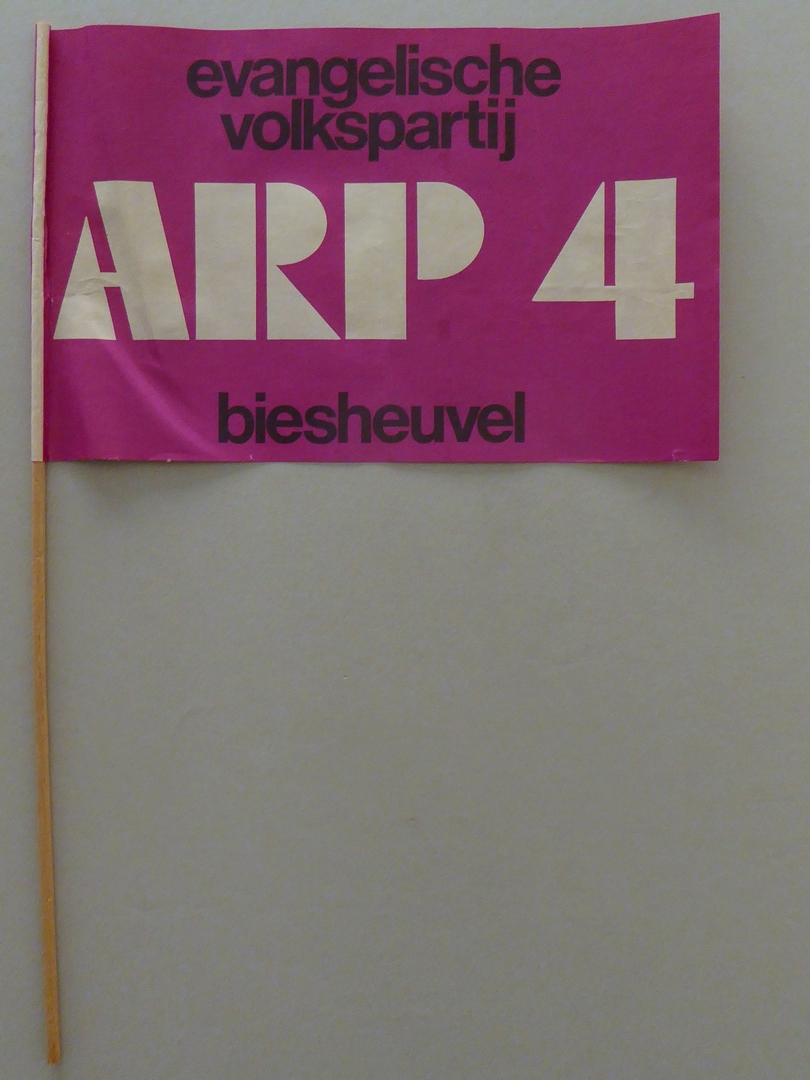 Propagandamateriaal ARP verkiezingscampagne 1971: Paars vlaggetje met "... ARP 4 Biesheuvel"