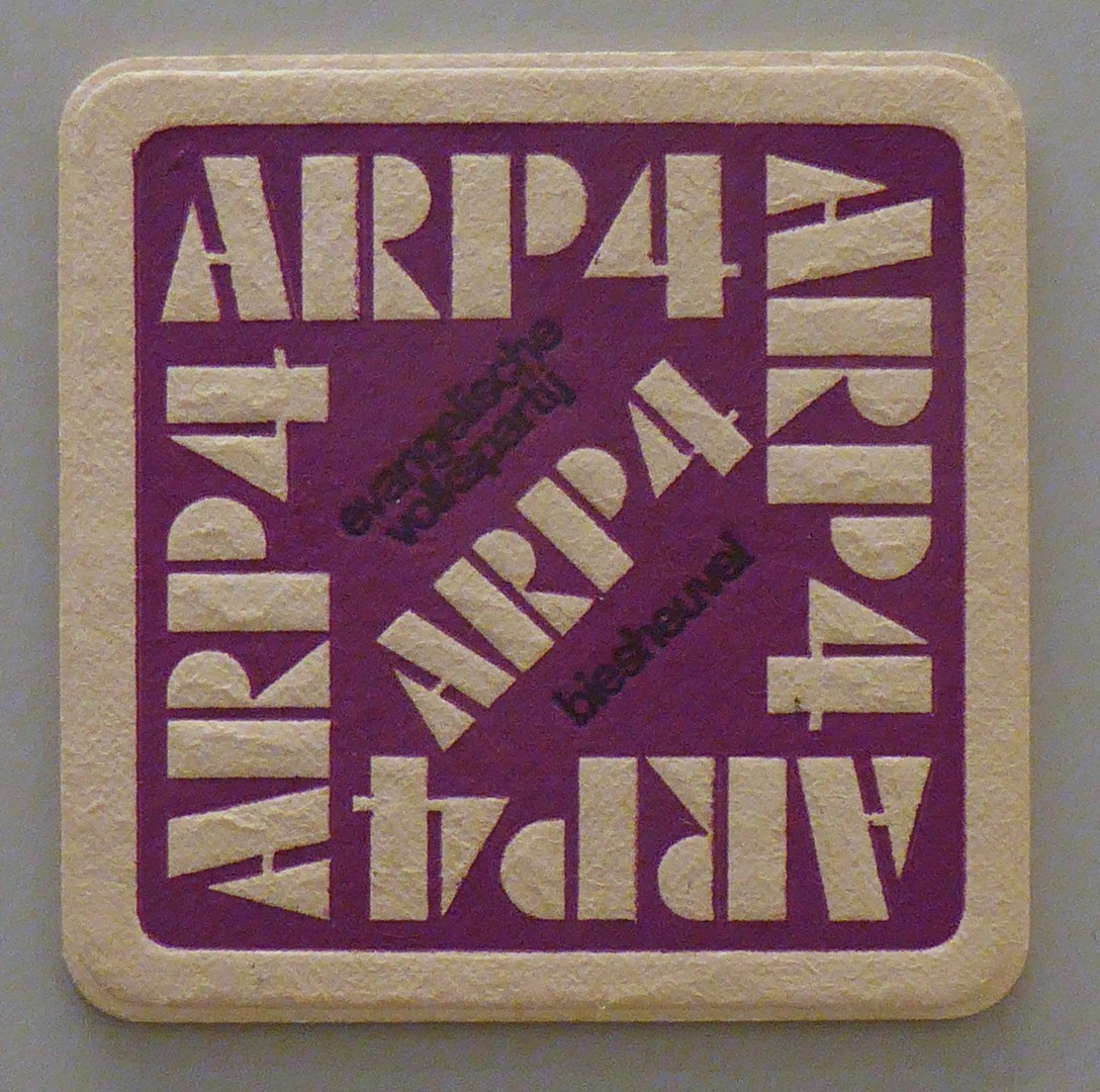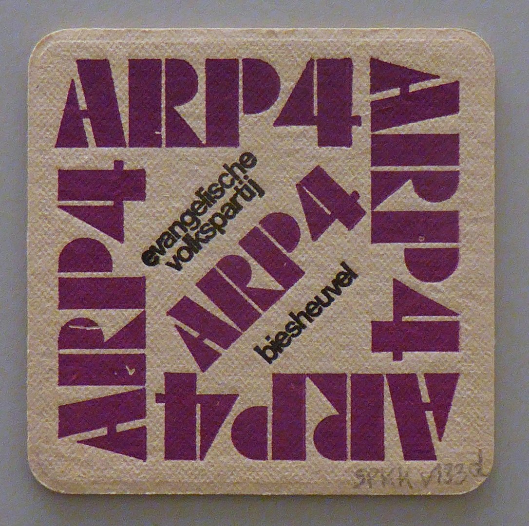 Propagandamateriaal ARP verkiezingscampagne 1971: Onderzetter met "... ARP 4 Biesheuvel"