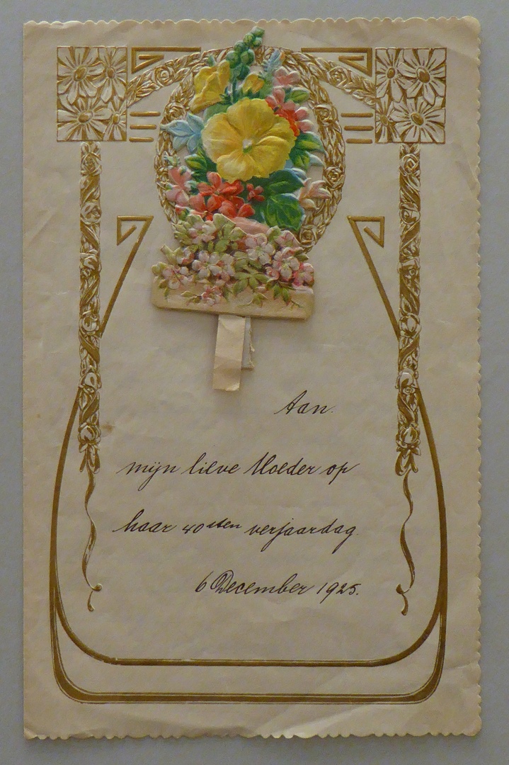 Handgeschreven verjaardagswens "Aan mijn lieve Moeder op haar 40sten verjaardag 6 December."