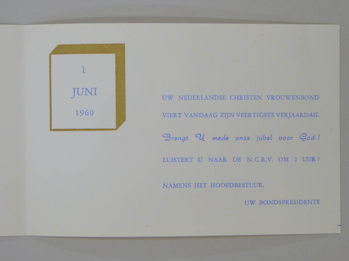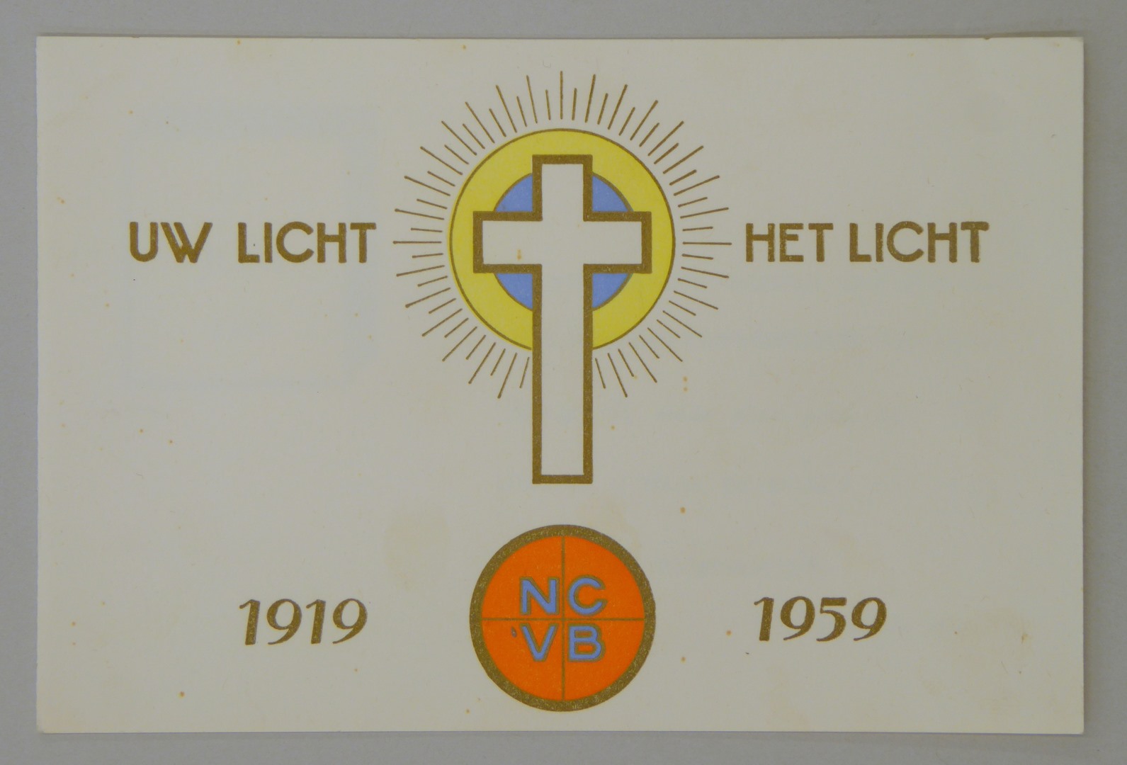 "Uw licht, het licht NCVB 1919-1959", t.g.v. 40ste verjaardag NCVB (Nederlandse Christen Vrouwenbond), met "... Luistert u naar de N.C.R.V. om twee uur? ..."