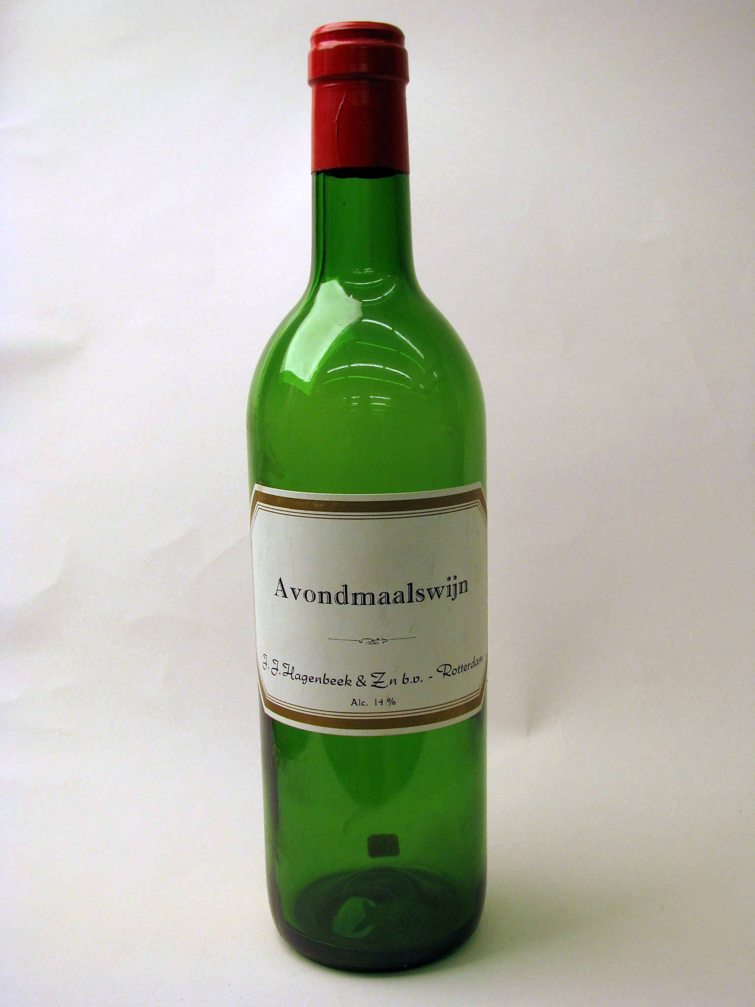 Groene fles, bestemd voor avondmaalswijn met wit etiket met gouden rand