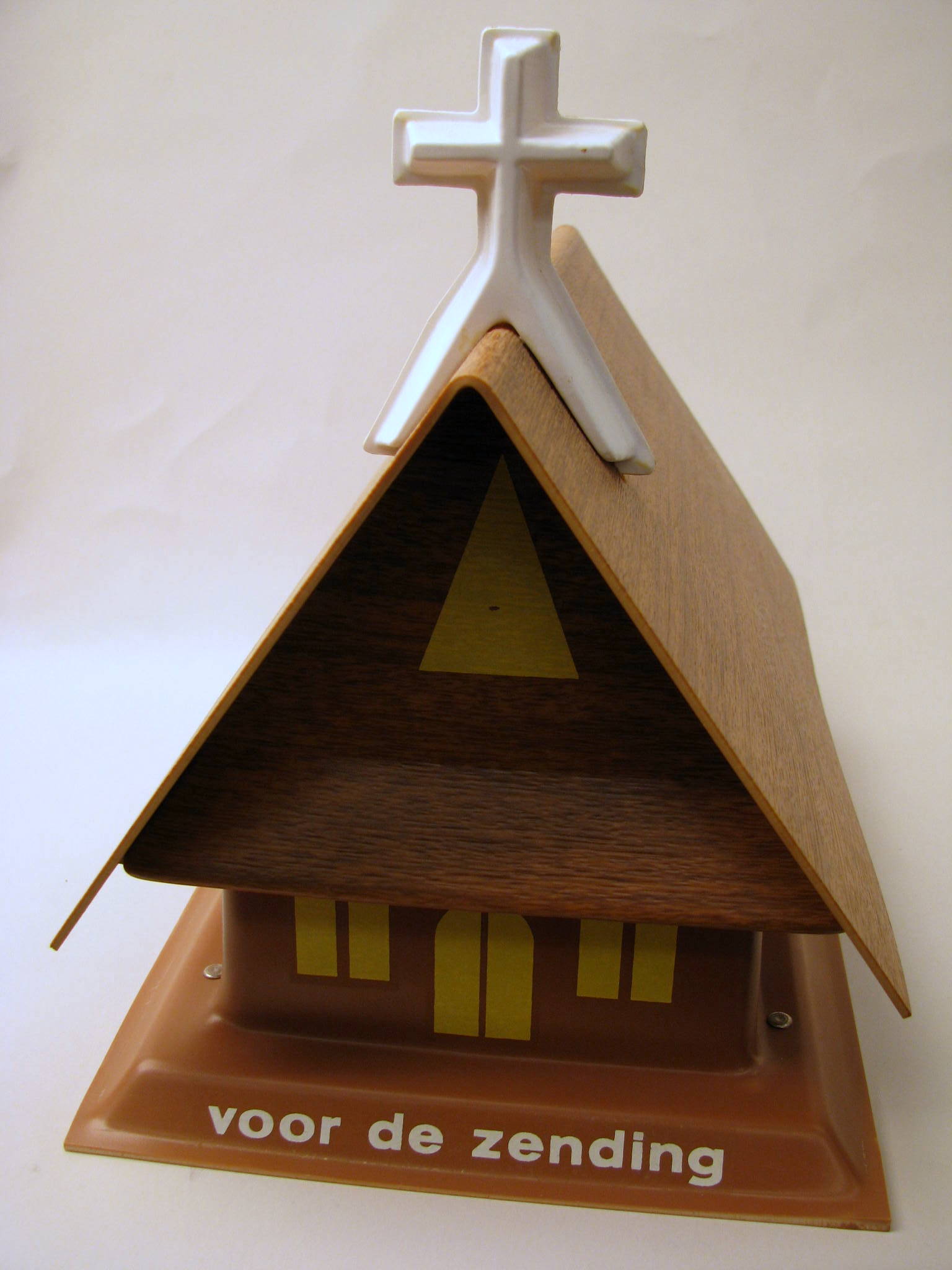 Spaarpot in model van een kerk, uitgegeven door Raad voor de Zending, voor scholen